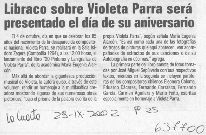 Con motivo de cumplirse 85 años del nacimiento de Violeta Parra, se anuncia el lanzamiento del libro “Veinte pinturas y lanigrafias de Violeta Parra” de la académica María Eugenia Alarcón. Respecto de la estructura de la publicación se informa que La primera parte del libro consta de fotos tomadas por José Miguel Sepúlveda con sus respectivos textos, mientras en la segunda se incluyen partituras de los compositores chilenos Eleonora Coloma, Eduardo Cáceres, Fernando Carrasco, Fernando García, Carmen Aguilera y Mario Feito, escritas especialmente en homenaje a Violeta Parra.
