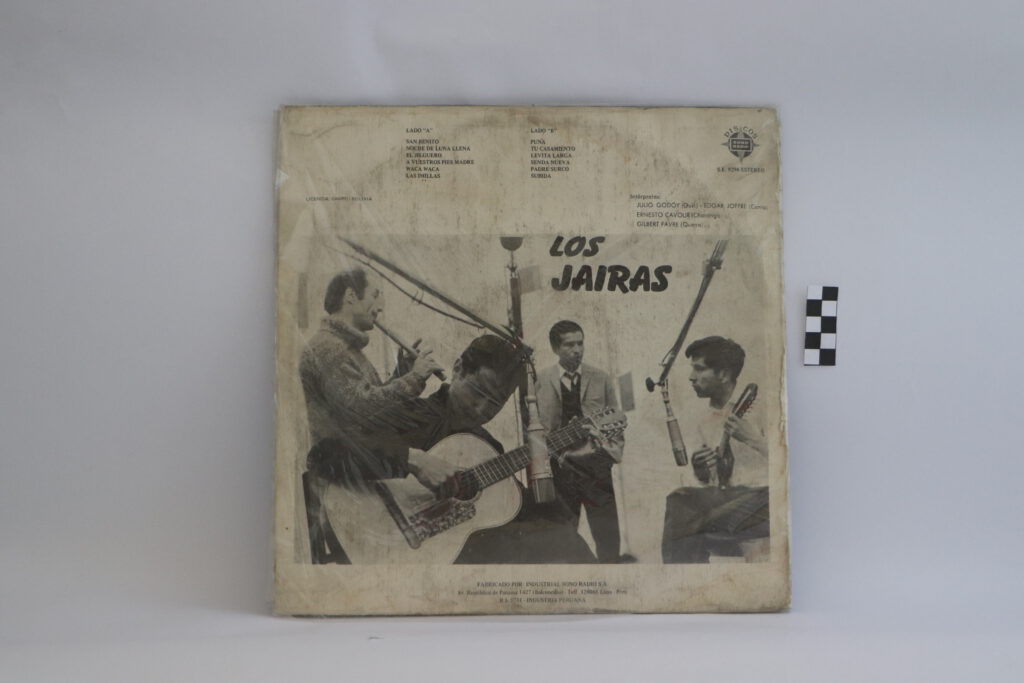 Disco de 33 RPM. En el radio interior, una etiqueta con diseño de cintas concéntricas de colores: rojo, amarillo, verde, anaranjado (de la periferia hacia el centro). Se encuentra al interior de una carátula cuadrada de cartón impreso. Por anverso, en la zona inferior pero abarcando 2/3 del encuadre se halla una fotografía en blanco y negro donde se observa al grupo Los Jairas tocando sus instrumentos rodeados de personas. Arriba, el título del disco en letras anaranjadas. Por reverso, en la zona superior, la lista de temas y hacia la izquierda, el nombre de los miembros de la agrupación. En la zona inferior, una fotografía en blanco y negro de Los Jairas tocando al interior de un estudio. Se reconocen micrófonos. El álbum contiene los temas: 1. San Benito, 2. Noche de luna llena, 3. El jilguero, 4. A vuestros pies madre, 5. Waca Waca, 6. Las Imillas, 7. Puna, 8. Tu casamiento, 9. Levita larga, 10. Senda nueva, 11. Padre Surco, 12. Subida.