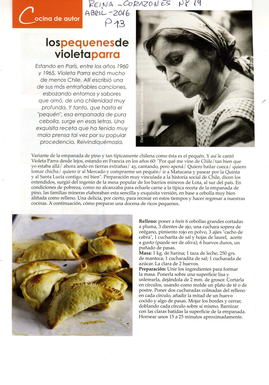 Revista de circulación en la comuna de La Reina con breve reseña biográfica de Violeta Parra y la nostalgia por Chile que sentía cuando vivía en París. Este texto incluye fotografías de la artista.