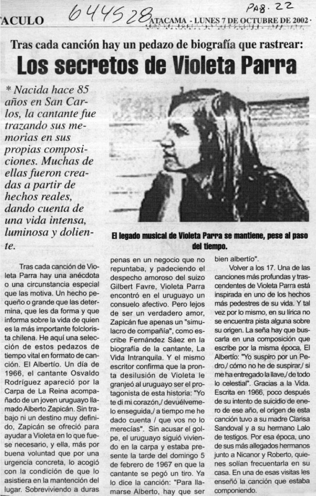 El artículo plantea, e lustra con algunos ejemplos, que tras cada canción de Violeta Parra hay una anécdota o una circunstancia especial que las motiva. “Un hecho pequeño o grande que las determina, que les da forma y que informa sobre la vida de quien es la más importante folclorista chilena”. Los ejemplos se refieren a la canción “El albertío”, a “Volver a los 17” y “Gracias a la vida”.
