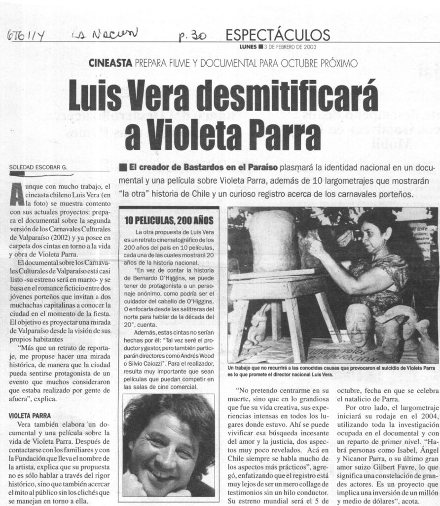 Artículo sobre el trabajo cinematográfico del director de cine Luis Vera, quien cuenta que entre otros proyectos “ya posee en carpeta dos cintas en torno a la vida y obra de Violeta Parra”. La nota informa que, “después de contactarse con los familiares y con la Fundación que lleva el nombre de la artista, explica que su propuesta no es sólo hablar a través del rigor histórico, sino que también acercar el mito al público sin los clichés que se manejan en torno a ella”. El cineasta agrega: “No pretendo centrarme en su muerte, sino que en lo grandiosa que fue su vida creativa, sus experiencias intensas en todos los lugares donde estuvo. Ahí se puede vivificar esa búsqueda incesante del amor y la justicia, dos aspectos muy poco revelados”.