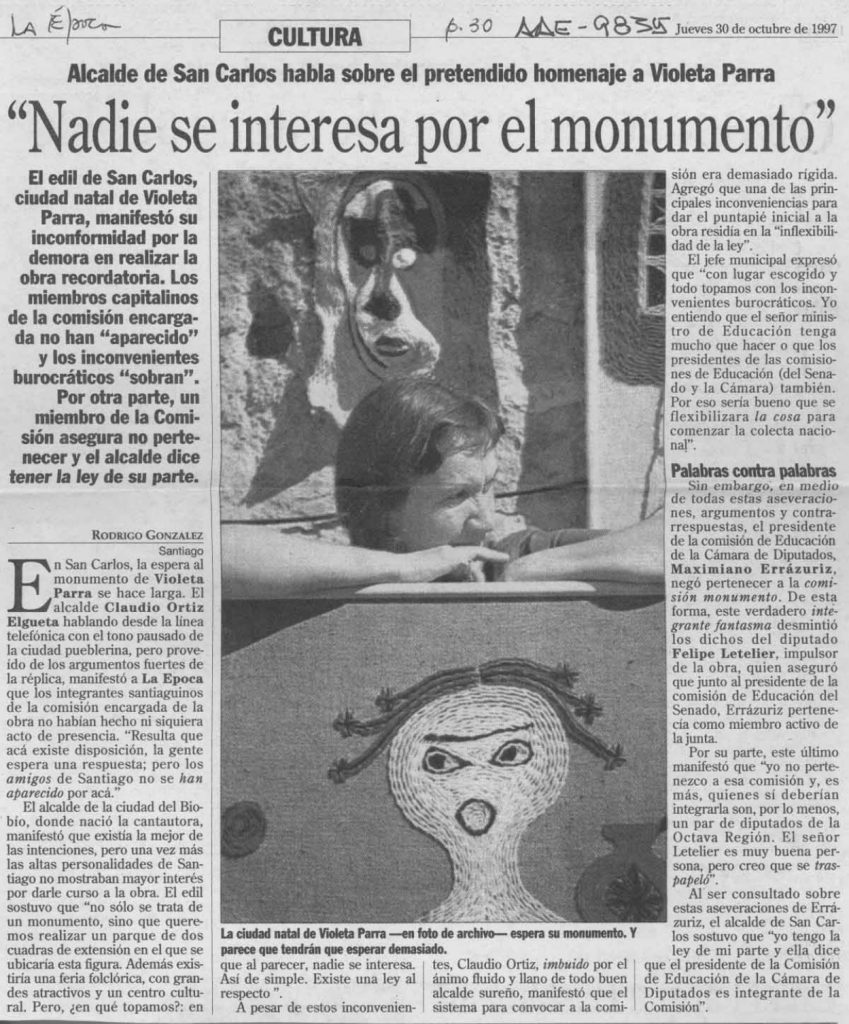 El artículo informa sobre el reclamo efectuado por el alcalde de esa época Claudio Ortiz Elgueta de San Carlos por el atraso de la construcción de una obra en homenaje a la artista. Propone la realización de un monumento y de un parque dedicado a Violeta Parra en el cual debiera existir una feria dedicada al folclore.