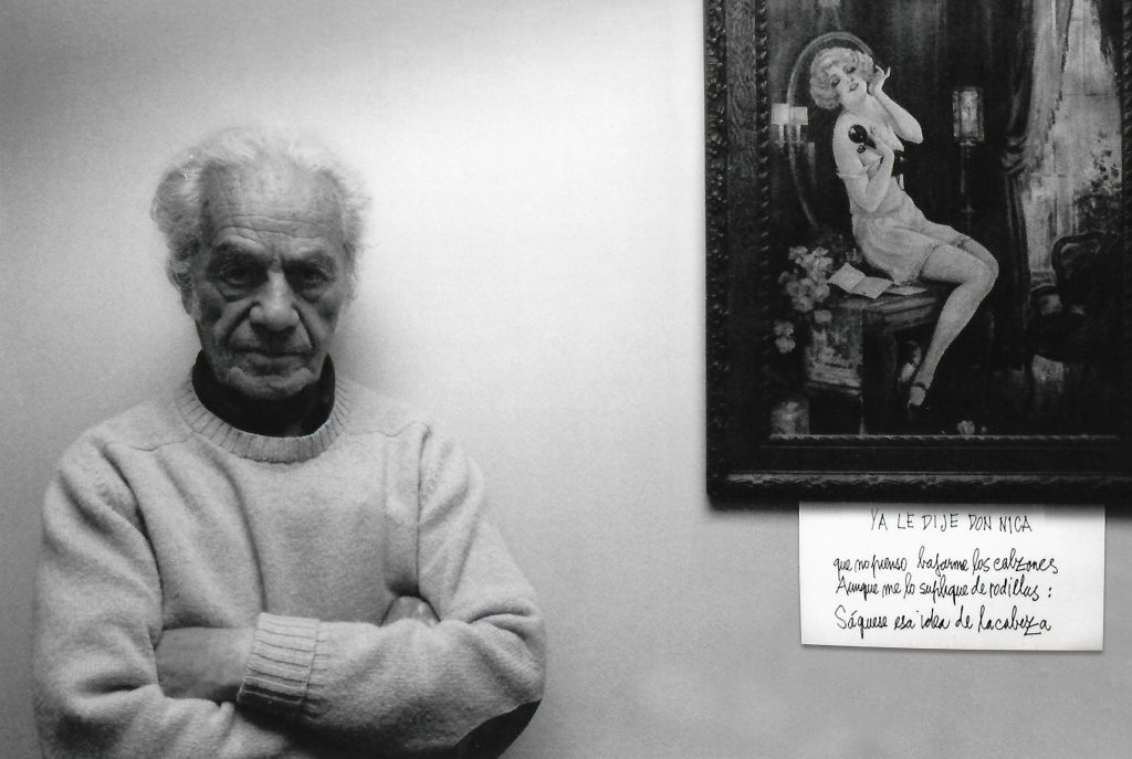 Nicanor Parra en la casa de Las Cruces junto a una de sus obras: “YA LE DIJE DON NICA que no pienso bajarme los calzones aunque me lo suplique de rodillas. Sáquese esa idea de la cabeza”. Imagen utilizada para acompañar la reseña del escritor en la Feria Internacional del Libro de Guadalajara, México.