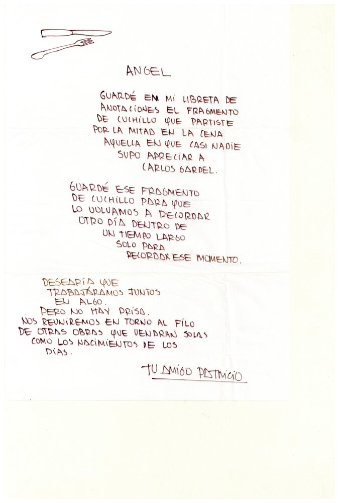 Nota escrita a mano de Patricio Guzmán a Ángel Parra menciona que conserva un fragmento de cuchillo que Parra partió por la mitad y manifiesta el anhelo de volverse a ver. Firmada "Tu amigo Patricio".