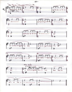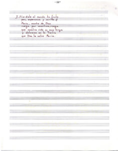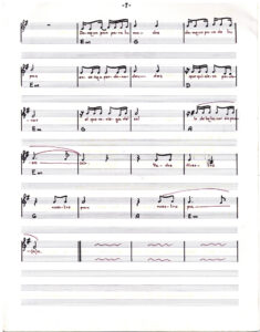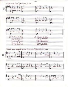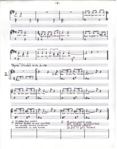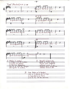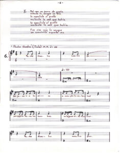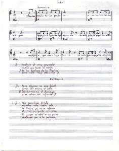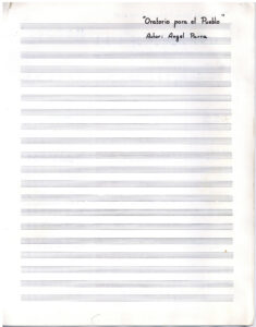 Partitura escrita a mano de Oratorio para el pueblo. En doce carillas se presentan las partituras de los tema que componen el álbum, acompañados de versos de las canciones.