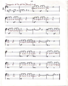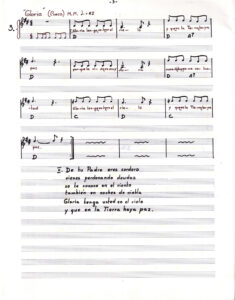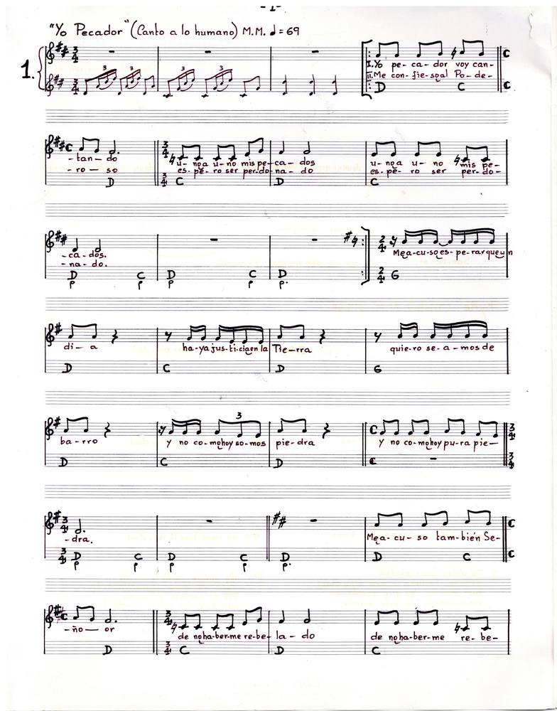 "Yo pecador" (Canto a lo humano), "Gloria" (cueca), "Credo" (Parabién), "Consagración del Pan y del Vino" (Pericona), "Padre Nuestro" (trote), "Cordero de Dios" (Rin), "Canto para después de la comunión" y "Ave María" (Tonada).