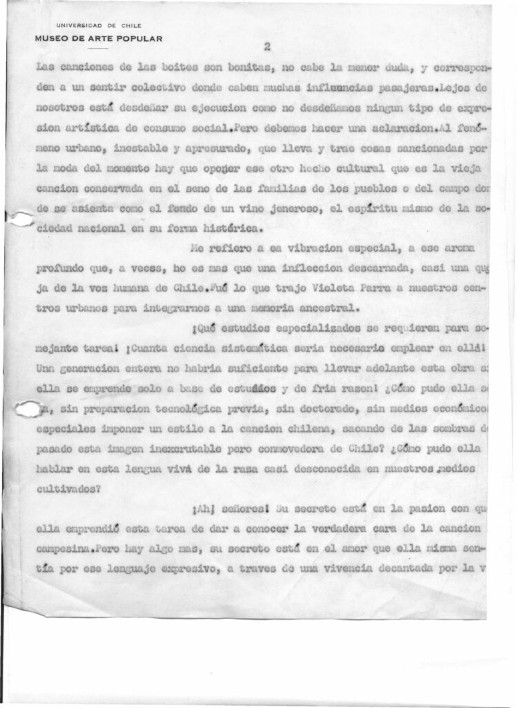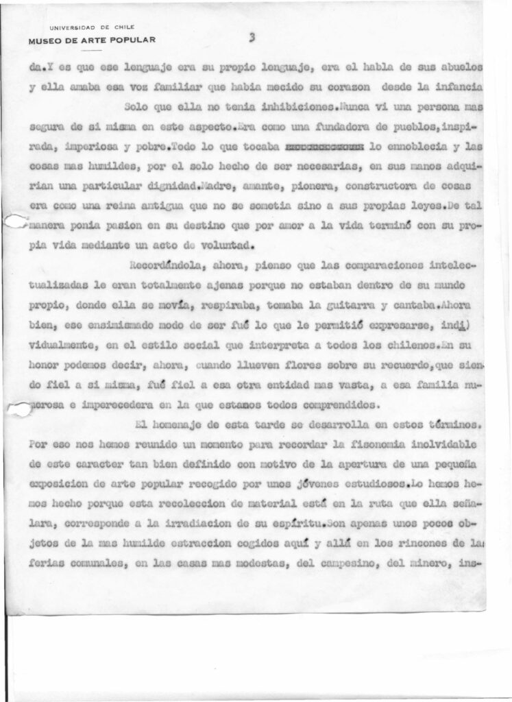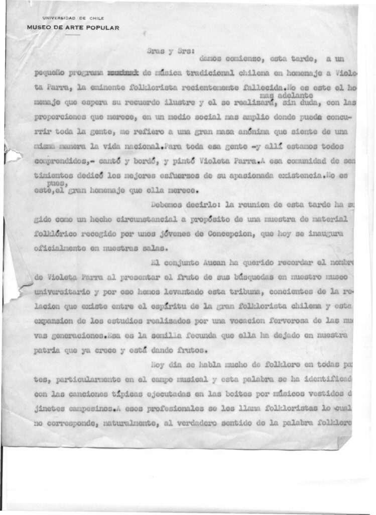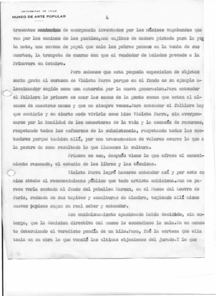 Discurso de Tomás Lago leído en el homenaje que realizó el Museo de Arte Popular Americano de la Universidad de Chile en honor a Violeta Parra, el 18 de febrero de 1967 en su sede del Castillo Hidalgo del Cerro Santa Lucía. En esté discurso el autor, y también director del Museo, revela detalles de la vida de Violeta y su relación con ella, abordando temas como su exposición de 1965 en el Pabellón Marsan del Louvre.