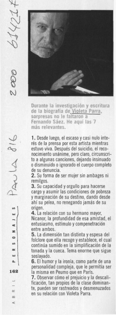 La reseña se refiere a las sorpresas que trajo la investigación y escritura de la biografía de Violeta Parra escrita por Fernando Sáez. En tre ellas, destaca capacidad y orgullo para hacerse cargo y asumir las condiciones de pobreza y marginación de su destino, dando desde ahí su pelea, no renegando jamás de su origen. También destaca el humor y la ironía, “como parte de una personalidad compleja, que le permitía ser la misma en Peumo que en París”. La nota se ilustra con una fotografía de Fernando Sáez.