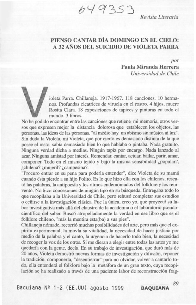 Artículo de corte académico. La autora que ha estudiado y antologado la poesía de Violeta Parra comparte sus reflexiones a propósito de un nuevo aniversario -32 años- del fallecimiento de la artista: El tono del artículo lo representa bien el siguiente párrafo: “No he podido encontrar entre las canciones que retiene mi memoria, otros versos que expresen mejor la distancia dolorosa que establecen los objetos, las personas, las ideas de las personas, "al medio hay un abismo sin música ni luz". Sin duda la Violeta, mi Violeta, que por cierto es demasiado distinta de la que posee el resto, sabía demasiado bien lo que hablaba o pintaba. Nada gratuito. Ninguna verdad dicha a medias. Ningún tapiz por encargo. Nada lanzado al azar. Ninguna amistad por interés. Remendar, cantar, actuar, bailar, para amar, componer. Todo en el mismo tejido y bajo la misma sensibilidad ¿popular? ¿chilena? ¿mujeril? ¿campesina?” La ensayista concluye: “La cobardía y la ignorancia no permiten dimensionar la mucha falta que hoy nos hace la Violeta. Necesito su choreza, su rareza, su marginalidad, su desenfado, su misterio. Si hubiese logrado cruzar el 68 y todo lo que vino después, probablemente cantaría con los raperos jóvenes y con los cantores de Aculeo, pero prefirió cantar "Dia domingo en el cielo", y parar su marcha el 67”.