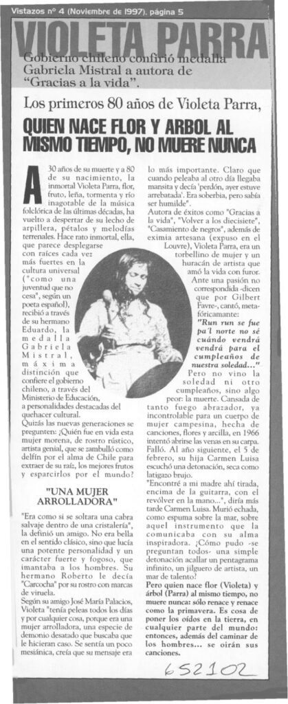 Artículo motivado por la entrega de la medalla Gabriela Mistral, instaurada por el Gobierno, a Violeta Parra representada por su hermano Eduardo. El artículo es un homenaje, que se detiene en la trayectoria y principalmente en el carácter de la artista, en el siguiente tenor: "Era como si se soltara una cabra salvaje dentro de una cristalería", la definió un amigo. No era bella en el sentido clásico, sino que lucía una potente personalidad y un carácter fuerte y fogoso, que imantaba a los hombres. En tono poético el artículo concluye: “quien nace flor (Violeta) y árbol (Parra) al mismo tiempo, no muere nunca: sólo renace y renace como la primavera. Es cosa de poner los oídos en la tierra, en cualquier parte del mundo: entonces, además del caminar de los hombres... se oirán sus canciones.