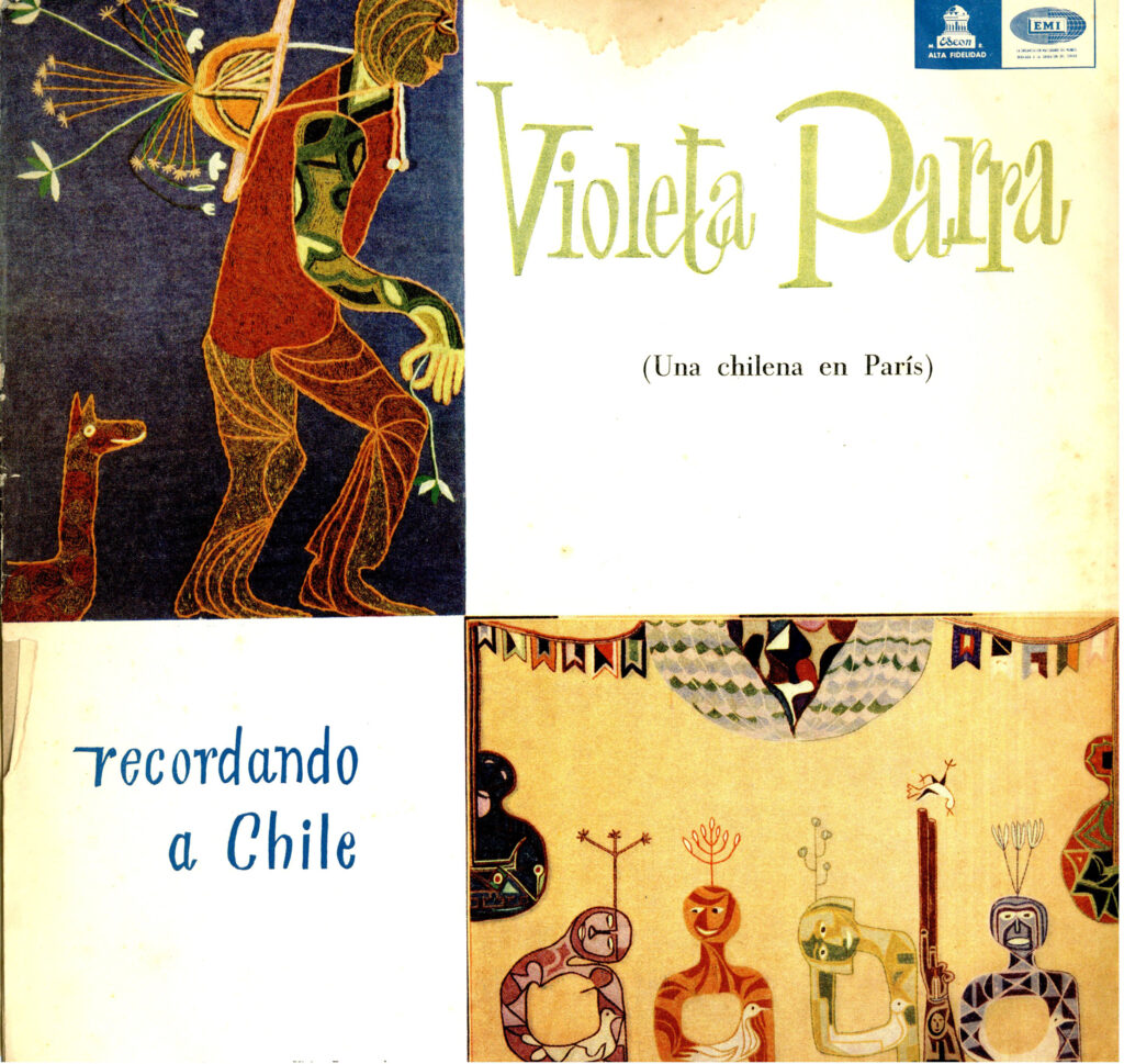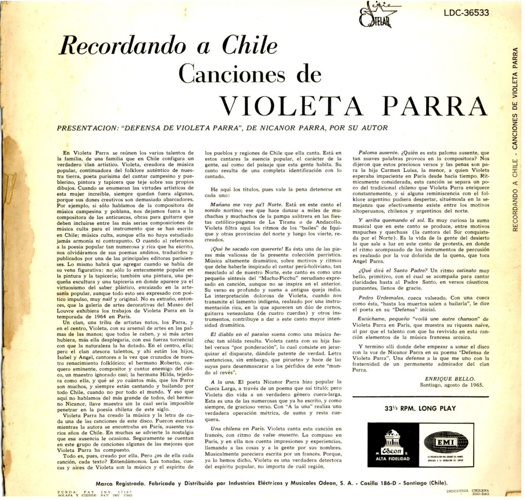 Disco de vinilo de 33 RPM. Se encuentra al interior de una carátula cuadrada de cartón impreso. Por anverso, hacia el costado superior izquierdo, se observa la reproducción de la arpillera de Violeta Parra “Hombre con sombrero”, al costado inferior derecho, se observa la reproducción de la arpillera de Violeta Parra “Contra la guerra”. El nombre de la autora aparece en letras verdes, al costado superior derecho y el título del vinilo, en letras azules, al costado inferior izquierdo. Por reverso, se halla el título del disco, el nombre de la autora, se agrega una breve reseña biográfica y la lista de temas incluidos en el disco con una breve descripción, escrito por Enrique Bello. El vinilo incluye los temas: 1. Defensa de Violeta Parra (Autor y lectura de Nicanor Parra; acompaña con guitarra, Violeta Parra), 2. Mañana me voy pa’l norte, 3. Qué he sacado con quererte, 4. El diablo en el paraíso, 5. A la una, 7. Una chilena en París, 8. Paloma ausente, 9. Y arriba quemando el sol, 10. Qué dirá el Santo Padre, 11. Pedro Urdemales, 12. Escúchame, pequeño.