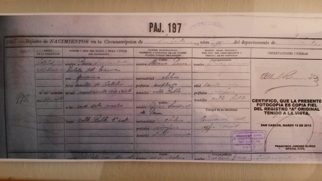 Registro de Nacimiento de Violeta del Carmen Parra Sandoval el 4 de octubre de 1917 en el Registro Civil de San Carlos.