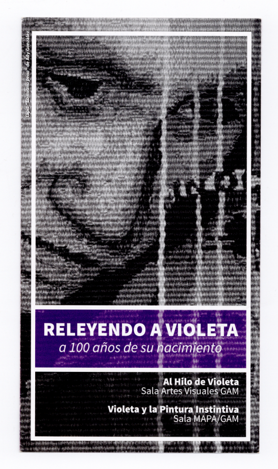 Tríptico con texto "Releyando a Violeta a 100 años de su nacimiento", preparado por Museo de Arte Popular Americano Tomás Lago (MAPA) de la Universidad de Chile