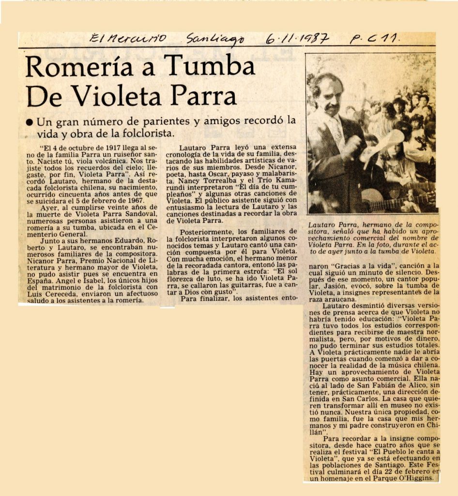 Al cumplirse veinte años de la muerte de Violeta Parra se informa la romería efectuada en el Cementerio General con la presencia de sus hermanos junto a otros cantores populares como Nancy Torrealba y el Trio Kamarundi.
