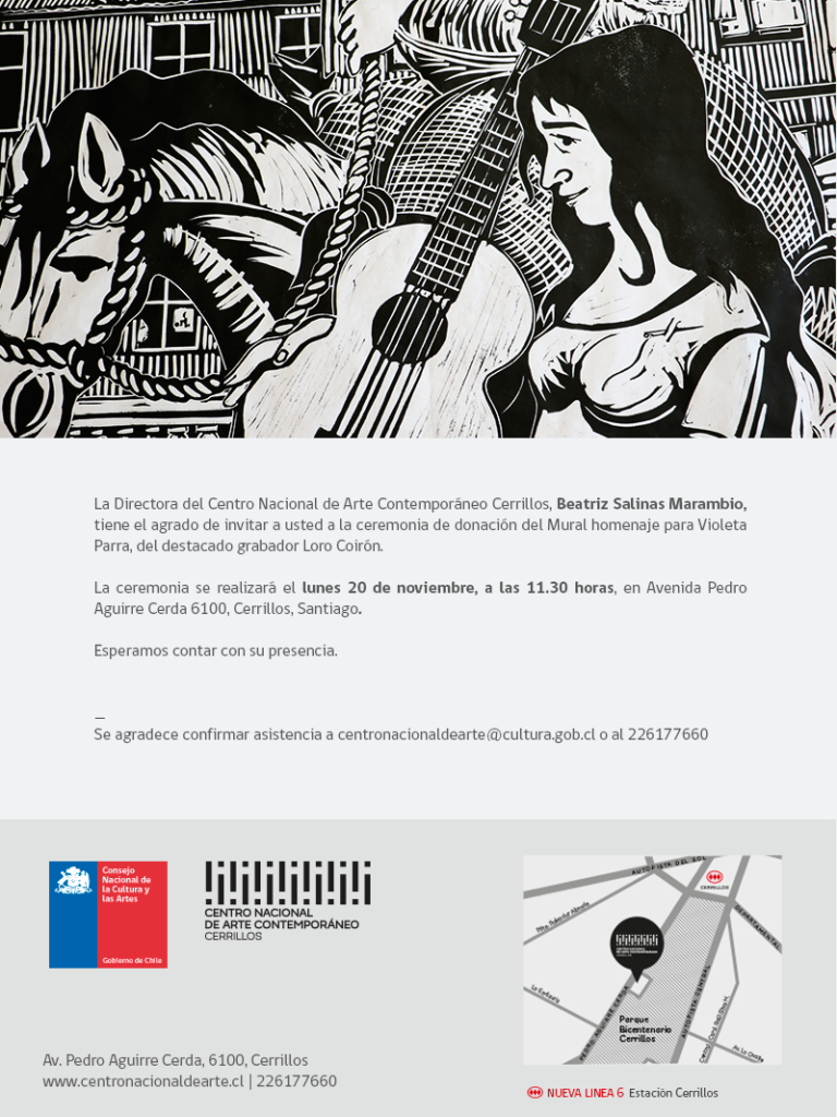 Invitación a la ceremonia de donación al Centro Nacional de Arte Contemporáneo de Cerrillos del Mural “Homenaje para Violeta Parra” realizado por Loro Coirón.