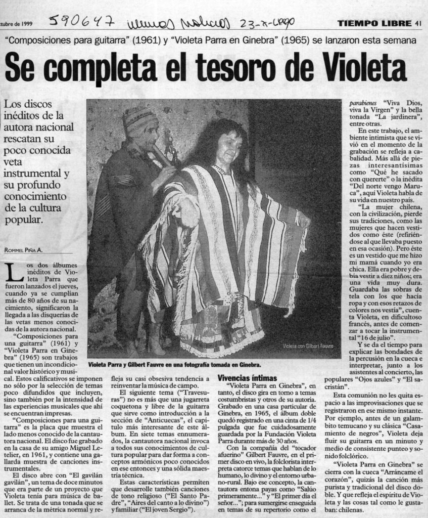 La nota informa sobre la presentación, como un acontecimiento, de dos obras inéditas de Violeta Parra: “Composiciones para una guitarra” (1961) y “Violeta Parra en Ginebra” (1965), trabajos de valor histórico y musical. Se trata de una selección de temas poco difundidos, también “por la intensidad de las experiencias musicales que ahí se encuentran impresas”. Entre las composiciones para guitarra se encuentra “El gavilán“, un tema de doce minutos que era parte de un proyecto que Violeta tenía para música de ballet; además de sus casi desconocidas “anticuecas”.En “Violeta Parra en Ginebra” se incluye la cueca “Arráncame el corazón”, según la publicación “quizás la canción más purista y tradicional del disco doble”.