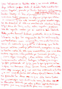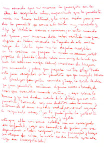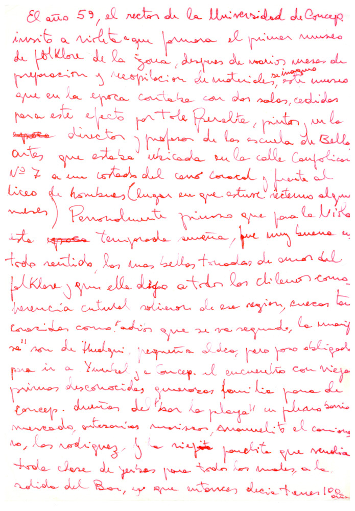 Manuscrito en tinta roja que relata la formación del primer museo de floklore de la zona de Concepción, con la invitación del rector de la Universidad de Concepción a Violeta Parra en 1959. La narración se detiene en cuecas de la época creadas en la ciudad penquista y sus alrededores. A continuación, relata los esfuerzos de Violeta por recopilar las canciones de la Panchita. Luego retoma el relato sobre la esfera artística en Concepción.
