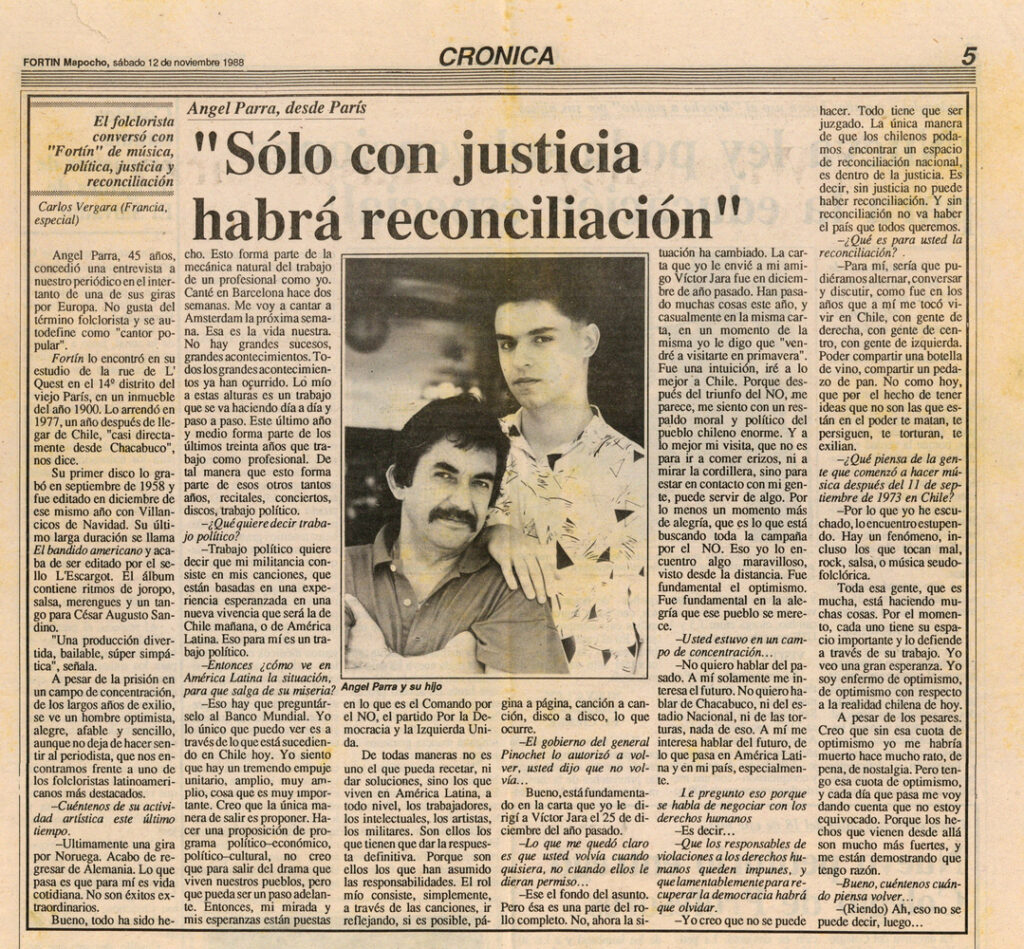 «Solo con justicia habrá reconciliación»; Ángel Parra, desde París