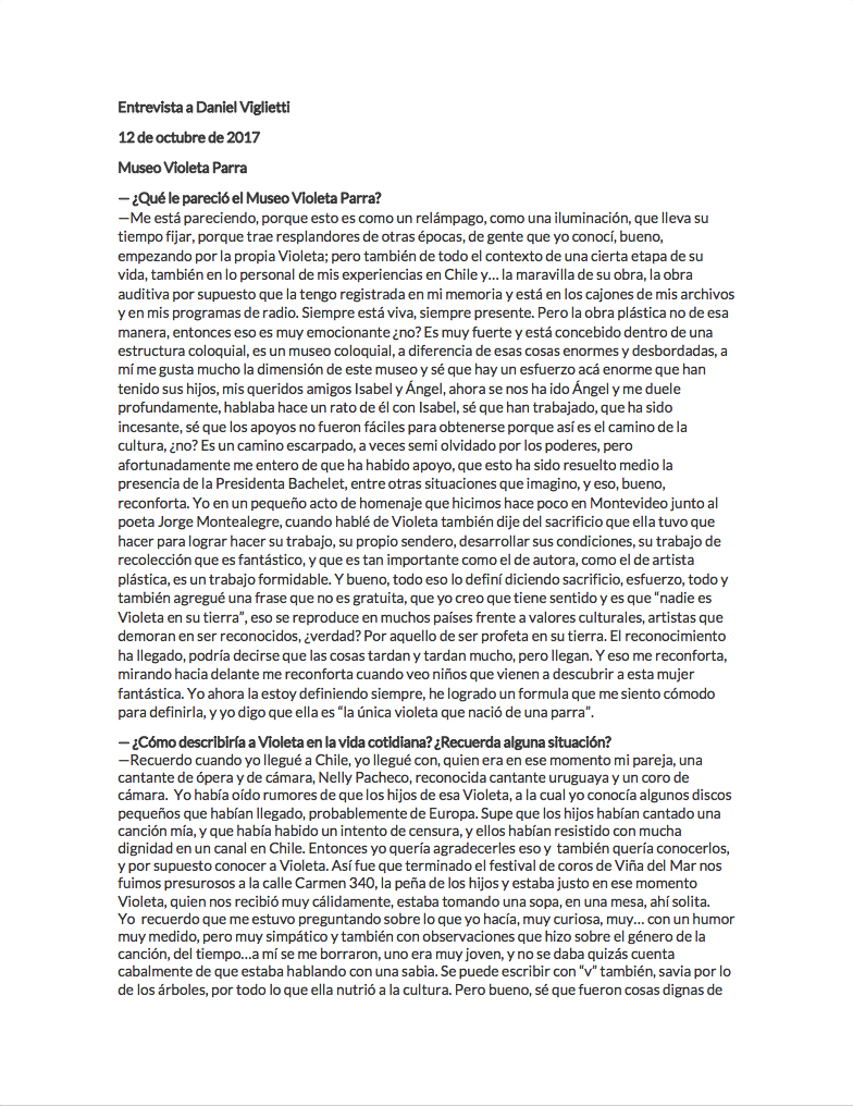 Transcripción de entrevista a Daniel Viglietti en Museo Violeta Parra