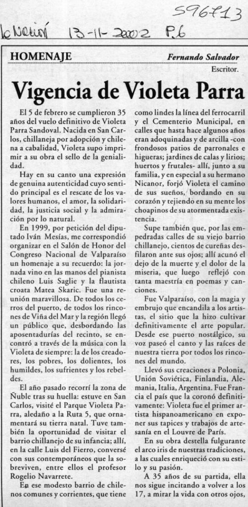 Al cumplirse 35 años del fallecimiento de Violeta Parra, el columnista le rinde homenaje y –junto con hacer una reseña de la trayectoria de la artista- recuerda específicamente la conmemoración en que el autor de la nota participó en 1999: “por petición del diputad0 Iván Mesías, me correspondió organizar en el Salón de Honor del Congreso Nacional de Valparaíso un homenaje a su recuerdo: la jornada vino en las manos del pianista chileno Luis Saglie y la flautista croata Matea Skaric. Fue una reuni6n maravillosa. De todos 1os cerros del puerto, de todos los rincones de Vña del Mar y la regi6n llegó un público que, desbordando las aposentadurías del recinto, se encontró a través de la música con la Violeta de siempre: la de los creadores, los pobres, los dolientes, los humildes, los sufrientes y los rebeldes”.