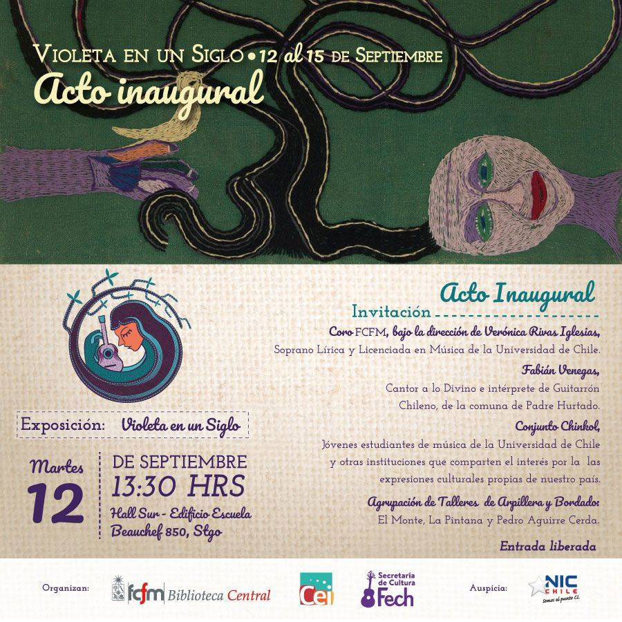 Invitación al acto inaugural de la exposición “Violeta en un siglo”, organizada en conmemoración de los cien años del nacimiento de la artista. La invitación detalla el programa del evento, efectuado en el Hall Sur del Edificio Escuela Beauchef de la Universidad de Chile.