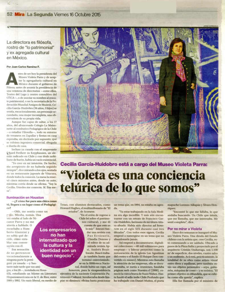 Entrevista a Cecilia García-Huidobro, entonces presidenta de la Fundación Museo Violeta Parra, quien se extiende sobre su interés en el patrimonio y la cultura; la colaboración pública-privada y principalmente sobre el legado de Violeta Parra a a quien considera “una columna de la identidad chilena. Ella nos conectó, con total autenticidad, con nuestras raíces”. En el curso de la entrevista agrega: “Algunos, durante mucho tiempo, no quisieron mirarla porque temían mirarse a sí mismos. La fuerza de Violeta está en que es una especie de conciencia telúrica de lo que somos. Cada vez que se la menosprecia, nos menospreciamos nosotros.” La entrevista incluye fotografía de Cecilia García-Huidobro.