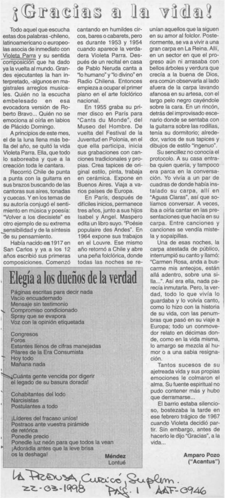 Este artículo se refiere a la vida y obra de Violeta Parra tanto de su obra visual como musical. Su éxito con su canción interpretada por varios artistas: “Gracias a la vida”. El autor describe La Carpa de La Reina la cual visitó en reiteradas ocasiones. También nos cuenta acerca de sus conversaciones con la artista.