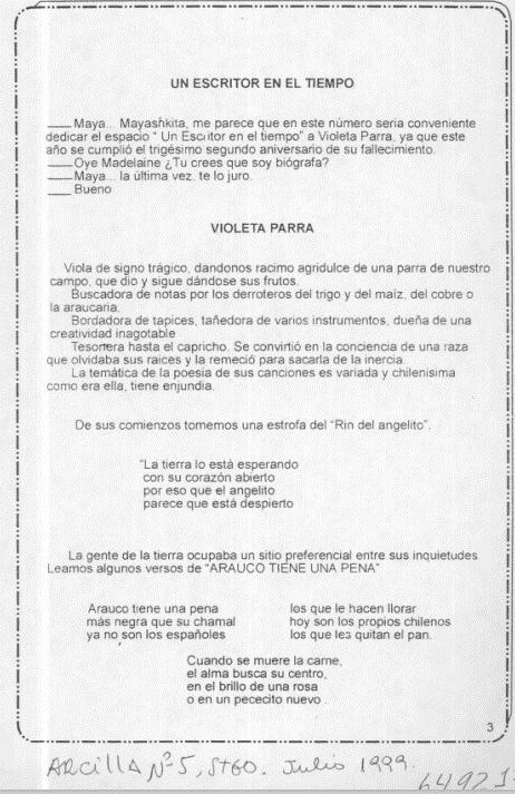 Columna “Un escritor en el tiempo” de Alicia Kemp, con viñetas de textos breves poéticos: “Viola de signo trágico, dándonos racimo agridulce de una parra de nuestro campo que dio y sigue dándose sus frutos. Buscadora de notas por los derroteros del trigo y del maíz, del cobre o la araucaria. Bordadora de tapices, tañedora de varios instrumentos, dueña de una creatividad inagotable. Tesonera hasta el capricho. Se convirtió en la conciencia de una raza que olvidaba sus raíces y la remeció para sacarla de la inercia”. Agrega citas de diferentes canciones de Violeta Parra.