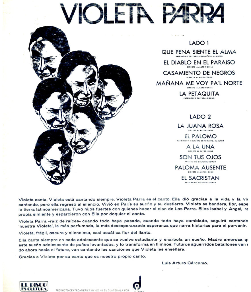 Disco de vinilo de 33 RPM. Se encuentra al interior de carátula rectangular de cartón impreso, con tintes blanco, amarillo y negro. Por anverso, se reconoce un retrato dibujado del rostro de Violeta Parra con el título del disco en letras negras. Por reverso, 6 retratos de Violeta Parra similares al de anverso, se ubican de manera yuxtapuesta hacia el costado izquierdo del encuadre. Al lado derecho, se halla la lista de temas incluidos en el disco. Abajo, datos de la edición. La carátula está inserta en un sobre plástico. Incluye los temas: 1. Qué Pena Siente El Alma, 2. El Diablo En El Paraíso, 3. Casamiento De Negros, 4. Mañana Me Voy Pal Norte, 5. La Petaquita, 6. La Juana Rosa, 7. El Palomo, 8. A La Una, 9. Son Tus Ojos, 10. Paloma Ausente, 11. El Sacristán