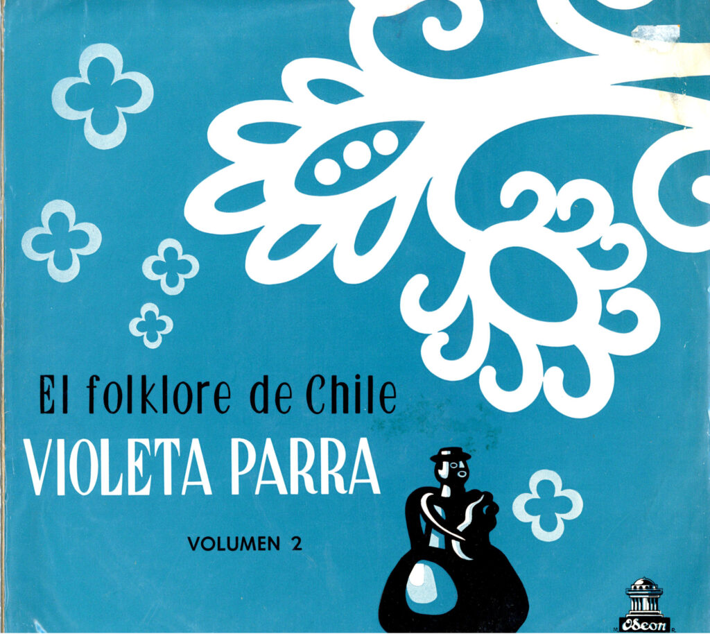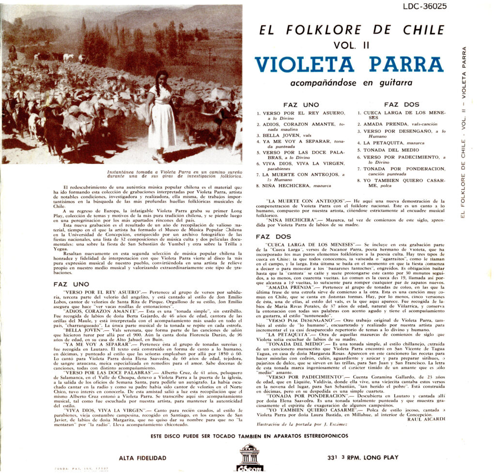 Disco de vinilo de 33 RPM. Se encuentra al interior de una carátula cuadrada de cartón impreso. Por anverso, sobre un fondo color cian, se observan formas decorativas, arabescos de color blanco y celeste. Abajo, hacia el costado derecho, la figura de lo que podría ser una cerámica de Quinchamalí. En la zona inferior, hacia la izquierda, aparece el título del vinilo en letras negras y, debajo, el nombre de la autora. Por el reverso, se reconoce, al costado izquierda, una fotografía de Violeta Parra en el campo. Además, se halla el título del disco, el nombre de la autora, se agrega una breve reseña biográfica y la lista de temas incluidos en el disco con una breve descripción. El vinilo incluye los temas: 1. Verso Por El Rey Asuero, 2. Adiós, Corazón Amante, 3. Bella Joven, 4. Ya Me Voy A Separar, 5. Verso Por Las Doce Palabras, 6. Viva Dios, Viva La Virgen, 7. La Muerte Con Anteojos, 8. Niña Hechicera, 9. Cueca Larga De Los Meneses, 10. Amada Prenda, 11. Verso Por Desengaño, 12. La Petaquita, 13. Tonada Del Medio, 14. Verso Por Padecimiento, 15. Tonada Por Ponderación, 16. Yo También Quiero Casarme.