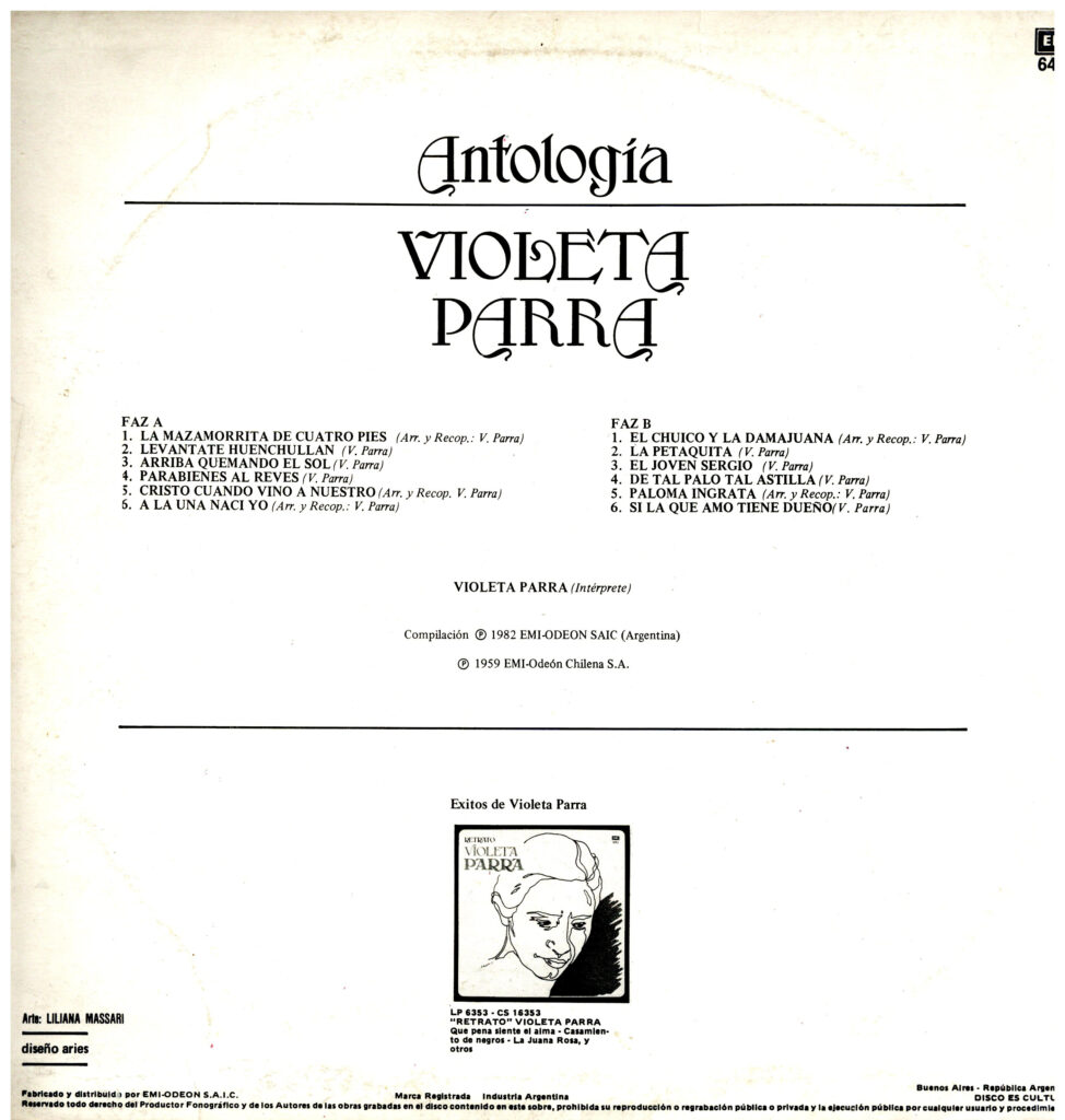 Disco de vinilo de 33 RPM. Se encuentra al interior de una carátula cuadrada de cartón impreso con tintes multicolor. Por anverso, se reconoce un retrato dibujado del rostro de Violeta Parra, a cuyo costado derecho se abre un paisaje, una suerte de campo con aves sobrevolando. Al lado superior izquierdo se inserta el título del disco en letras negras y el nombre de la autora en letras rosa. Por reverso, se halla el título del disco y el nombre de la autora con la misma tipografía que por anverso, además, se agrega la lista de temas incluidos en el disco. Abajo, datos de la edición. La carátula está inserta en un sobre plástico. Incluye los temas: 1. La mazamorrita de cuatro pies, 2. Levántate Huenchullán, 3. Arriba quemando el sol, 4. Parabienes al revés, 5. Cristo cuando vino a nuestro, 6. A la una nací yo, 7. El chuico y la damajuana, 8. La petaquita, 9. El joven Sergio, 10. De tal palo tal astilla, 11. Paloma ingrata, 12. Si la que amo tiene dueño