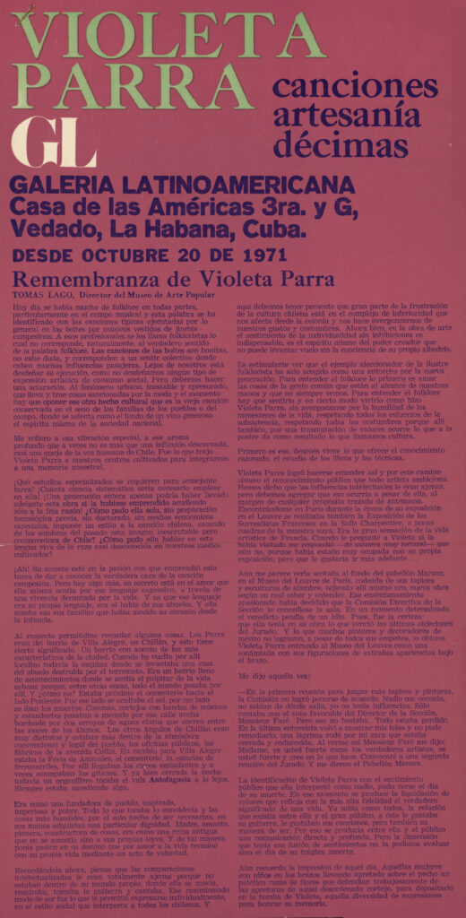 Folleto de la exposición "Violeta Parra. Canciones, artesanías, décimas" realizada en la Galería Latinoamericana de Casa de Las Américas en La Habana, Cuba; inaugurada el 20 de octubre de 1971. El folleto reproduce texto en homenaje a Violeta Parra escrito por Tomás Lago en 1967, momento en que se desempeñaba como director del Museo de Arte Popular Americano de la Universidad de Chile.