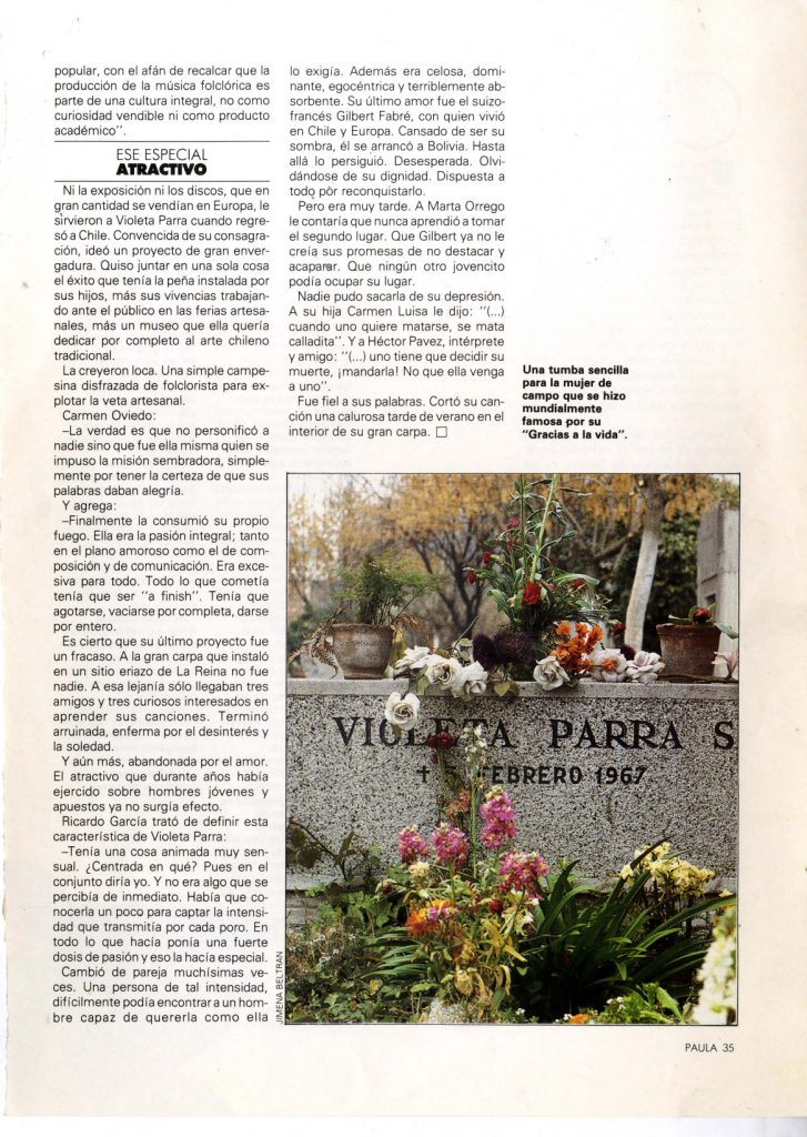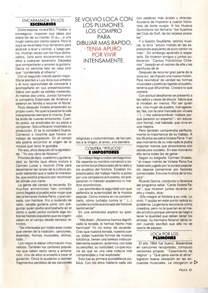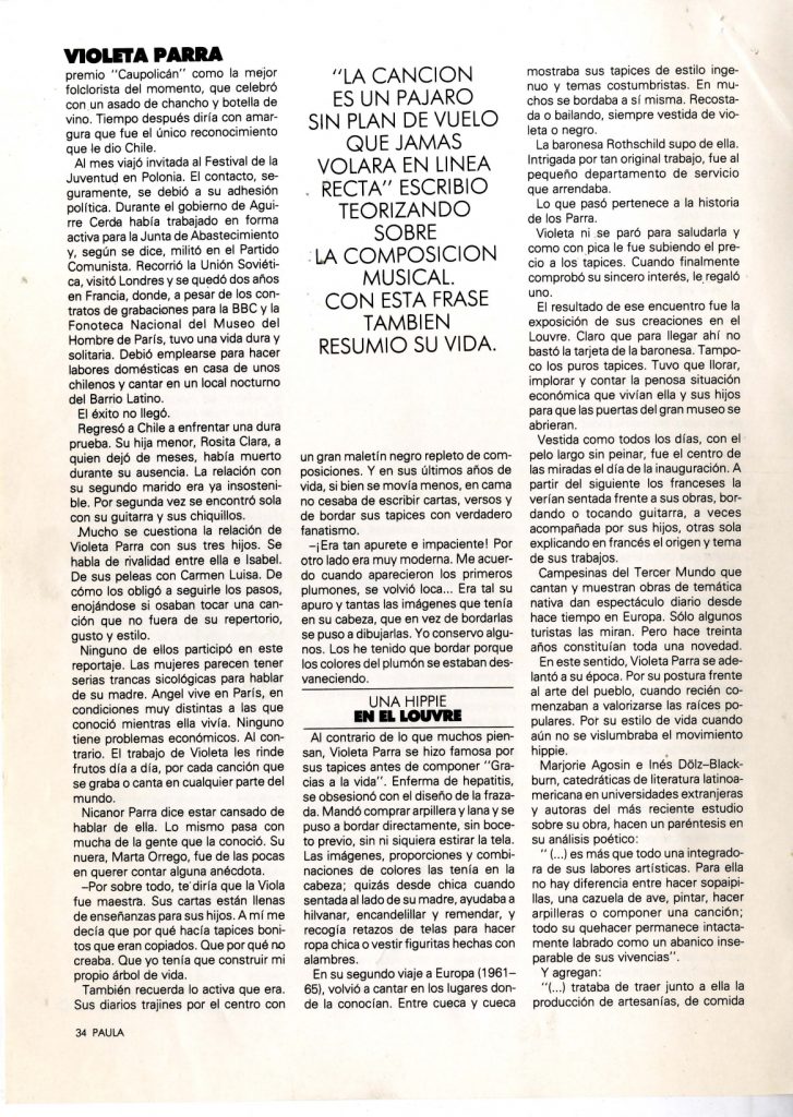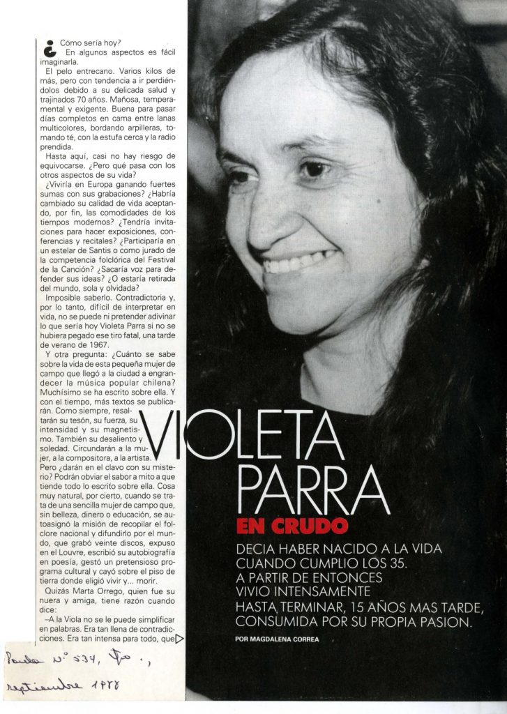 Artículo que incluye la vida y obra de Violeta Parra, entrevistas a algunos de sus familiares más directos. Una parte muy importante del artículo se refiere a su estadía en Europa, la producción de sus arpilleras y el fracaso del proyecto de La Carpa de la Reina.
