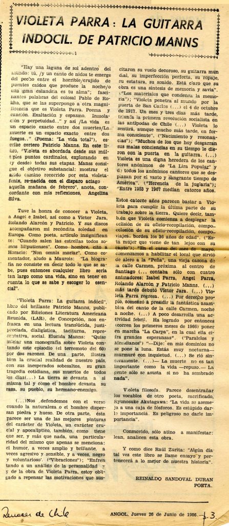 El poeta Reinaldo Sandoval se refiere al libro de Patricio Manns “Violeta Parra: la guitarra indócil”. El crítico encuentra que esta narración es muy buena puesto que logra plasmar la imagen y trabajo de Violeta Parra.