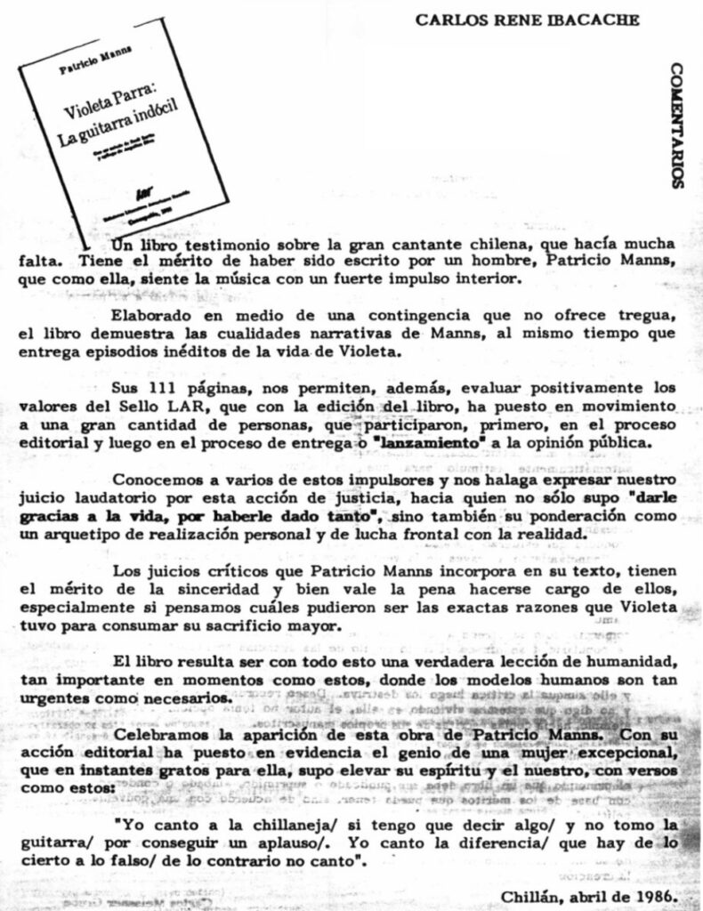 El escritor celebra la aparición del libro biográfico de Violeta Parra, “La guitarra indócil”, escrito por Patricio Manns. Destaca que la obra es una “verdadera lección de humanidad” y que el libro está escrito “en medio de una contingencia que no ofrece tregua”. El libro, agrega, “demuestra las cualidades narrativas de Manns, al mismo tiempo que entrega episodios inéditos de la vida de Violeta”. También manifiesta que los juicios críticos que Patricio Manns incorpora en su texto, “tienen el mérito de la sinceridad y bien vale la pena hacerse cargo de ellos, especialmente si pensamos cuales pudieron ser las exactas razones que Violeta tuvo para consumar su sacrificio mayor”.
