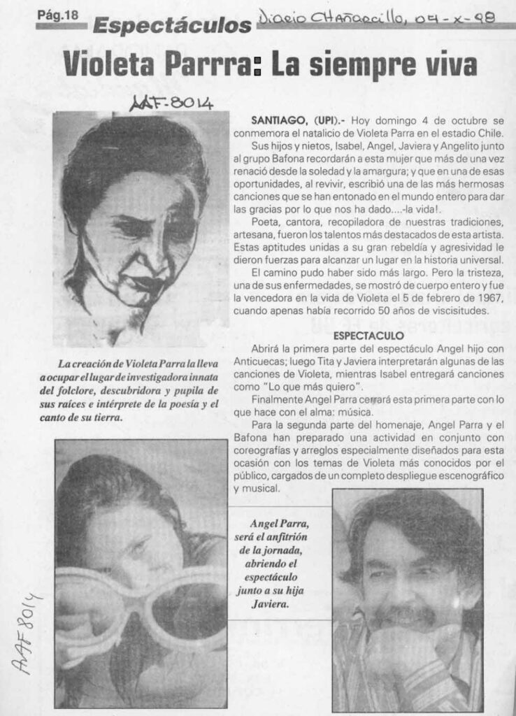 El domingo 4 de octubre se conmemora el natalicio de Violeta Parra en el Estadio Chile. Participaron de éste espectáculo los hijos de la artista de Violeta y cuatro nietos. La primera parte del recital estuvo a cargo de Ángel Cereceda Orrego interpretando las Anticuecas e Isabel Parra canciones del repertorio de Violeta Parra. Y por último se contó con la participación del grupo Ballet Folklórico Nacional de Chile que rindió un homenaje a Violeta Parra.