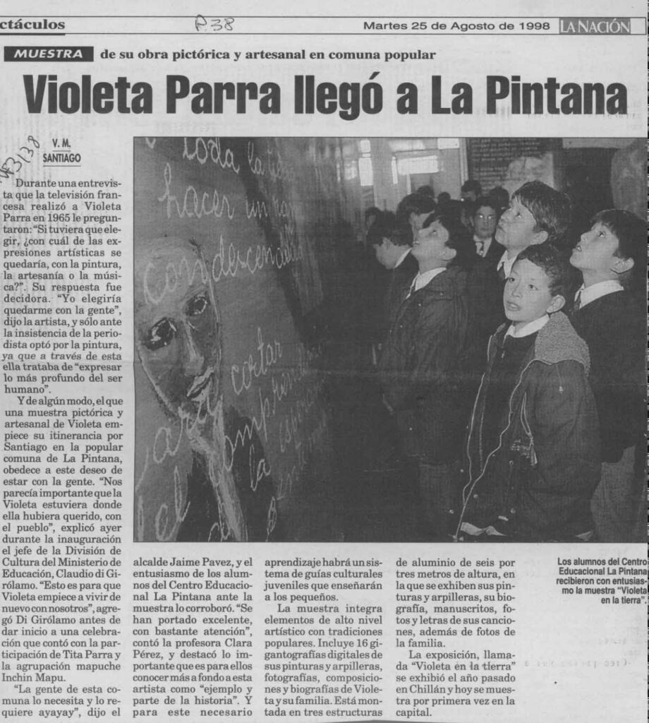 Este artículo se refiere a la exposición de la obra pictórica y artesanal realizada en la comuna de La Pintana. Esta muestra fue inaugurada por el Jefe de la División de Cultura del Ministerio de Educación, el alcalde de La Pintana y su nieta Violeta Parra. Esta muestra incluye gigantografías digitales de sus pinturas, arpilleras, fotografías y composiciones musicales de la artista.