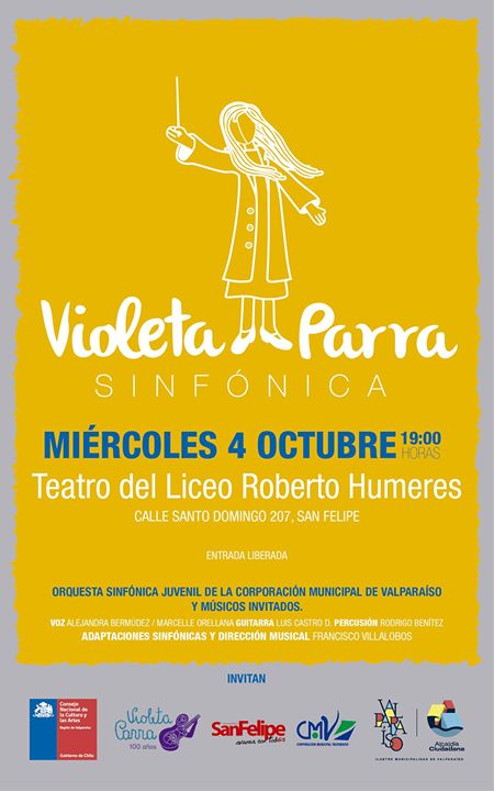 Afiche que difunde la actividad “Violeta Parra Sinfónica” organizada en San Felipe. La interpretación estuvo a cargo de la Orquesta Sinfónica Juvenil de la Corporación Municipal de Valparaíso y otros grupos invitados.