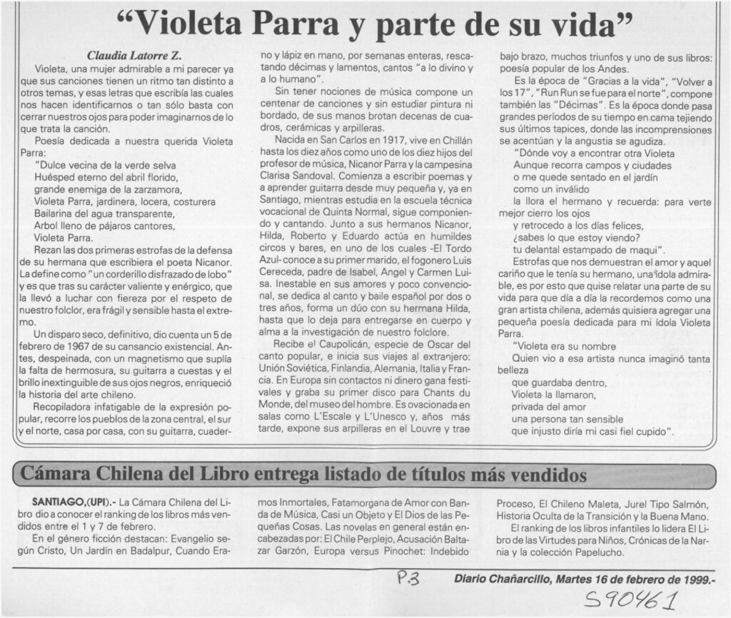 Artículo de homenaje, conmemorando un nuevo aniversario del fallecimiento de Violeta Parra. La autora del texto hace una síntesis de la obra de la artista recorriendo “La defensa de Violeta Parra escrita por su hermano Nicanor. “Estrofas –dice la columnista- que nos demuestran el amor y aquel cariño que le tenía su hermano, una'ídola admirable, es por esto que quise relatar una parte de su vida para que día a día la recordemos como una gran artista chilena, además quisiera agregar una pequeña poesía dedicada para mi ídola Violeta Parra”.