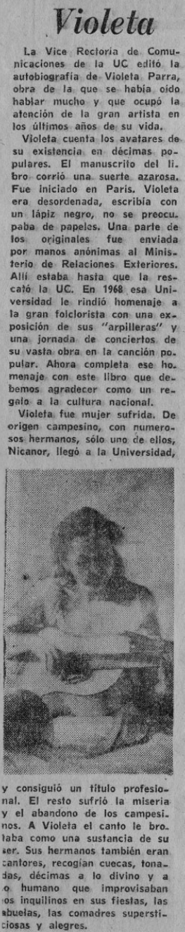 “Violeta”. Breve reseña biográfica de Violeta Parra. Informa sobre la edición de libro Décimas. Autobiografía en verso de Violeta Parra, publicada por la Universidad Católica junto a la editorial española Pomaire.