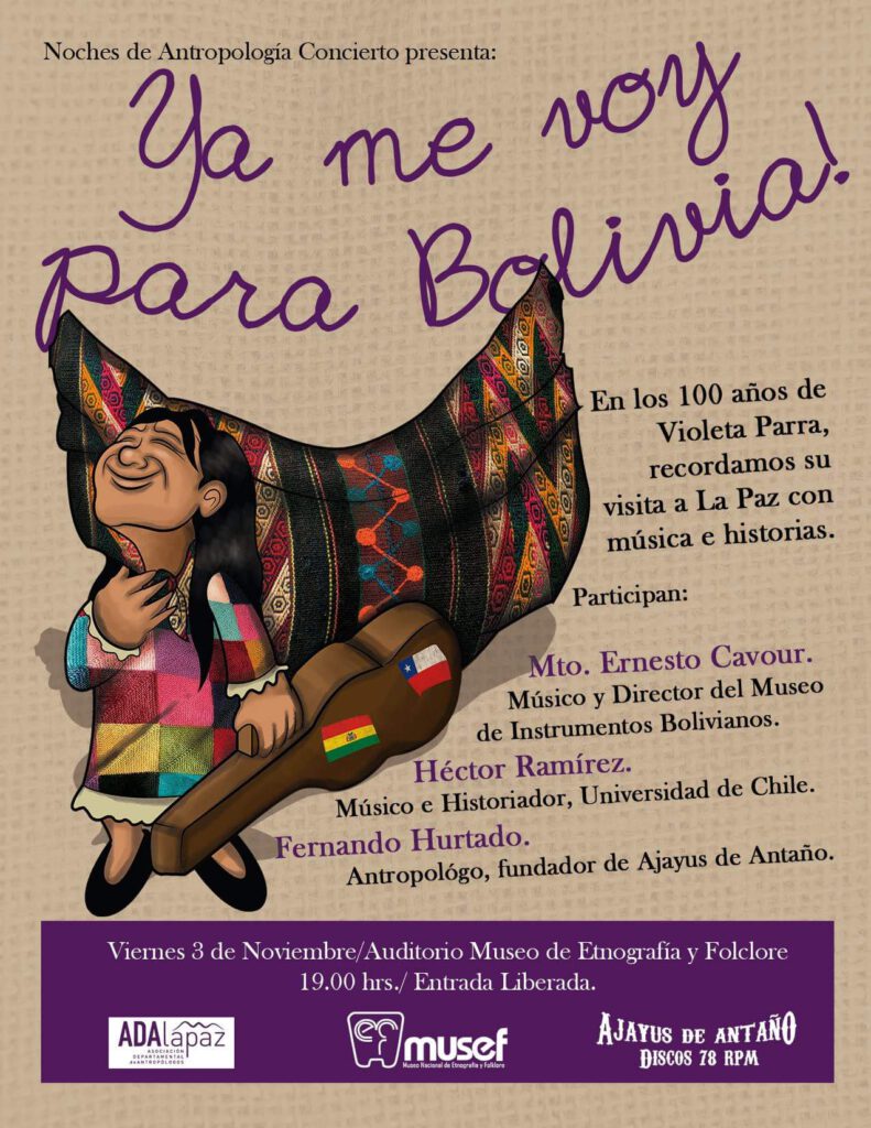 Afiche del homenaje musical realizado por el Museo de Etnografía y Folclore de La Paz a Violeta Parra en el centenario de su nacimiento, con el objeto de recordar el paso de la artista por dicha ciudad. Participaron de la actividad Ernesto Cavour, Héctor Ramírez y Fernando Hurtado.