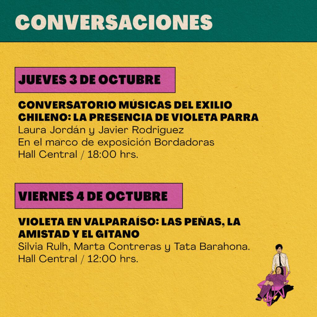 1. Descripción: Un diálogo que explorará la influencia de Violeta Parra en la música del exilio chileno, en el marco de la exposición «Bordadoras».