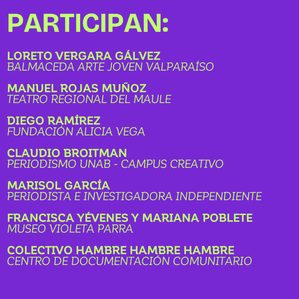 Participan: Loreto Vergara Gálvez, encargada de comunicaciones de Balmaceda Arte Joven – Valparaíso; Manuel Rojas Muñoz, coordinador de comunicaciones del Teatro Regional del Maule; Diego Ruiz, director de proyectos de Fundación Alicia Vega; Camila González Simón y Daniela Josefina del Colectivo Hambre Hambre Hambre; Francisca Yévenes y Mariana Poblete, jefa de comunicaciones y periodista digital del Museo Violeta Parra; Claudio Broitman, director de la Escuela de Periodismo de la Universidad Andrés Bello y Marisol García, periodista e investigadora independiente.