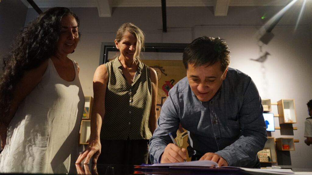 El convenio fue celebrado en medio de la muestra de Violeta Parra junto a la presidenta de Sello Alerce, Viviana Larrea, hija de Ricardo García, quien posterior a la firma recorrió junto al Director (s), Roberto Guerra Veas, la Sala Museo Violeta Parra y tuvo la posibilidad de conocer en profundidad y detalle las obras; en el recorrido también participó la cantora popular y artista del sello, Cecilia Concha Laborda.