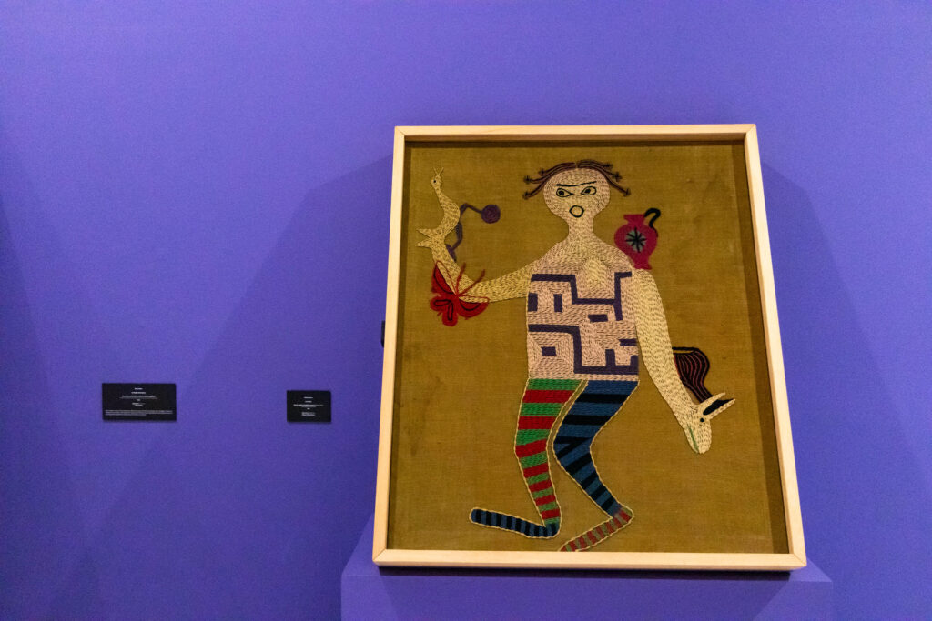 La exposición Recolectoras incluye una destacada selección de obras de Violeta Parra, entre ellas arpilleras y pinturas que dan cuenta de su visión única del mundo, así como su profunda conexión con las tradiciones populares y las luchas sociales.