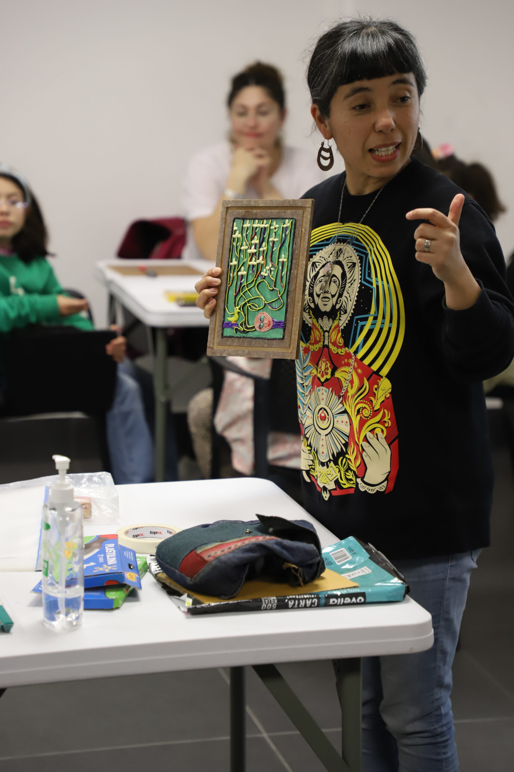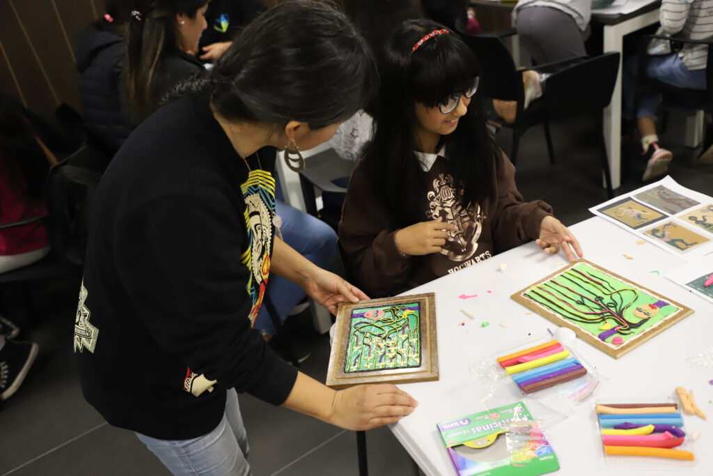 Dicho taller comenzó a las 16:00 horas en el espacio anteriormente indicado y fue impartido por Tamara González junto a Sindy González, quienes guiaron a los y las participantes a crear cuadros inspirados en la arpillera «El árbol de la vida» de Violeta Parra.