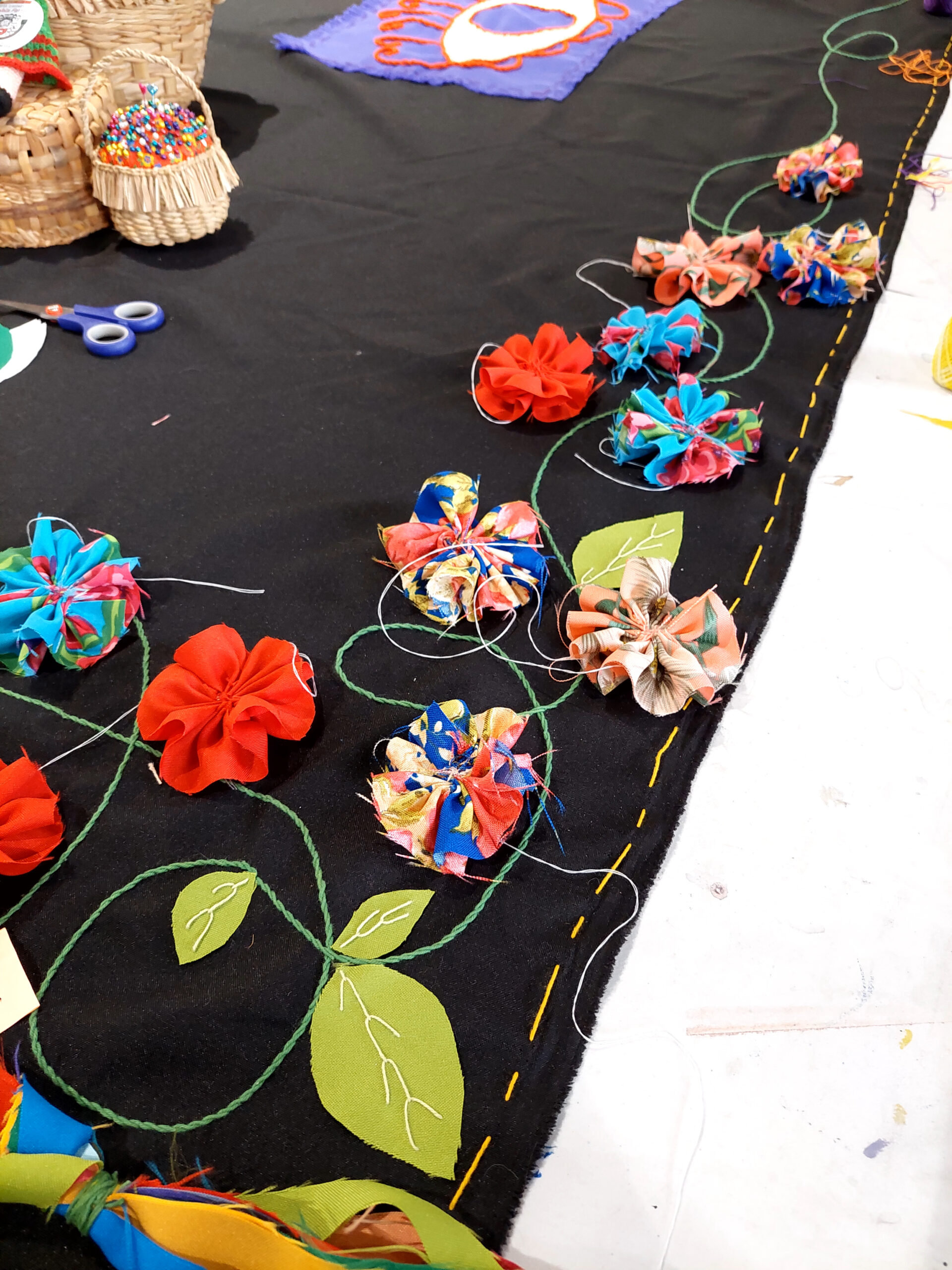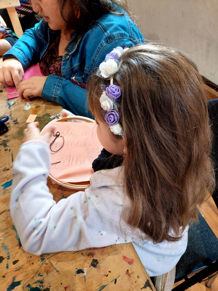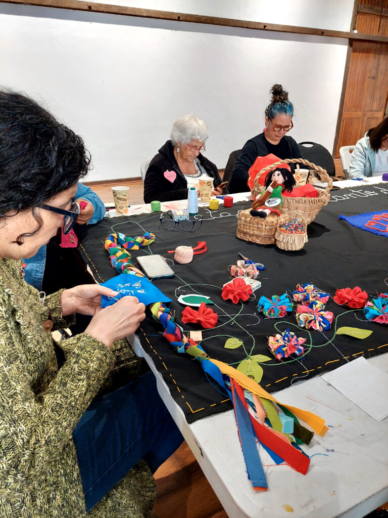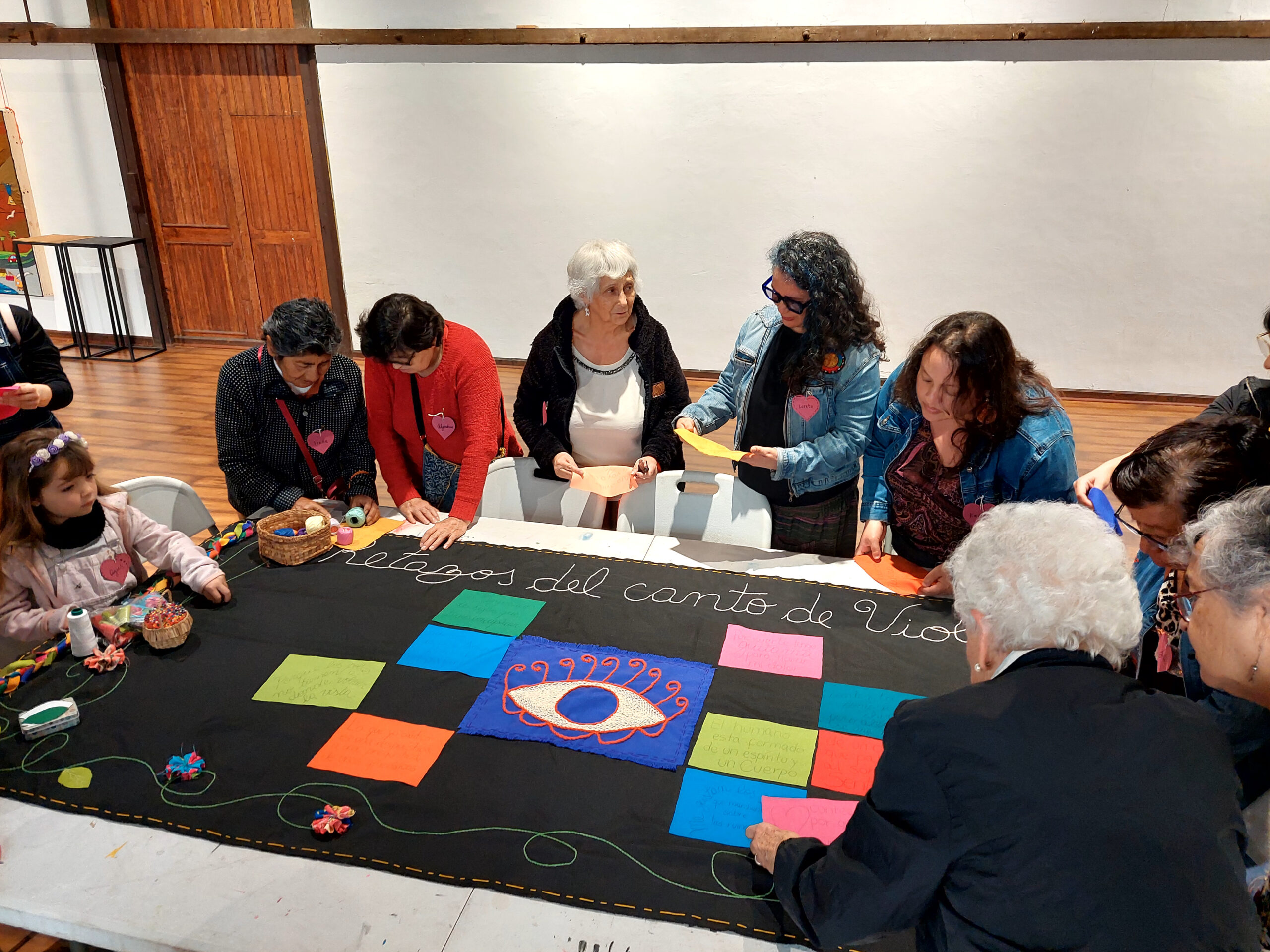 La instancia fue dirigida por la profesora de historia y gestora de la iniciativa «Arpilleras con memoria», quien inició el taller con una breve introducción del legado artístico de Violeta Parra, para que luego, las y los participantes bordaran un pequeño extracto de una canción de la cantautora para luego, cocerlo a una arpillera colectiva.