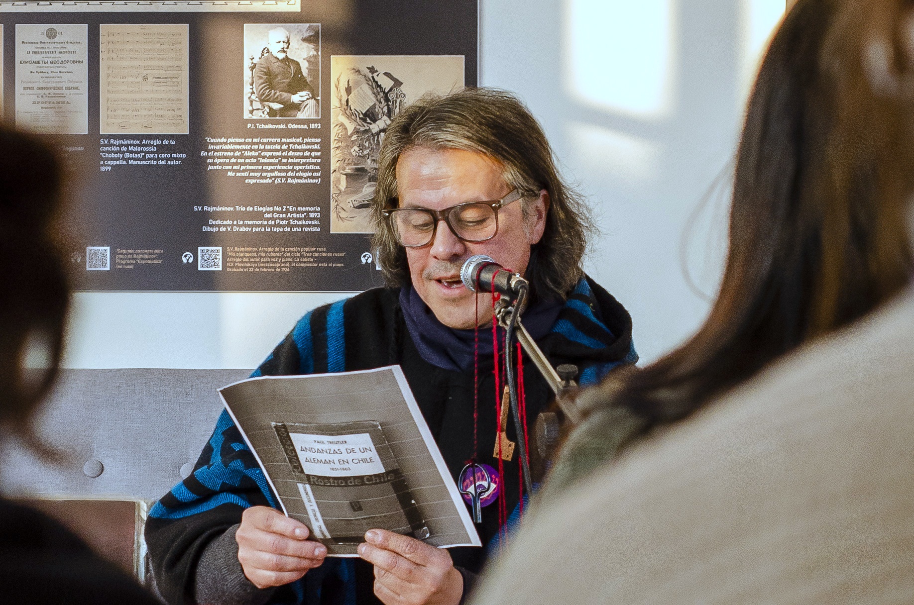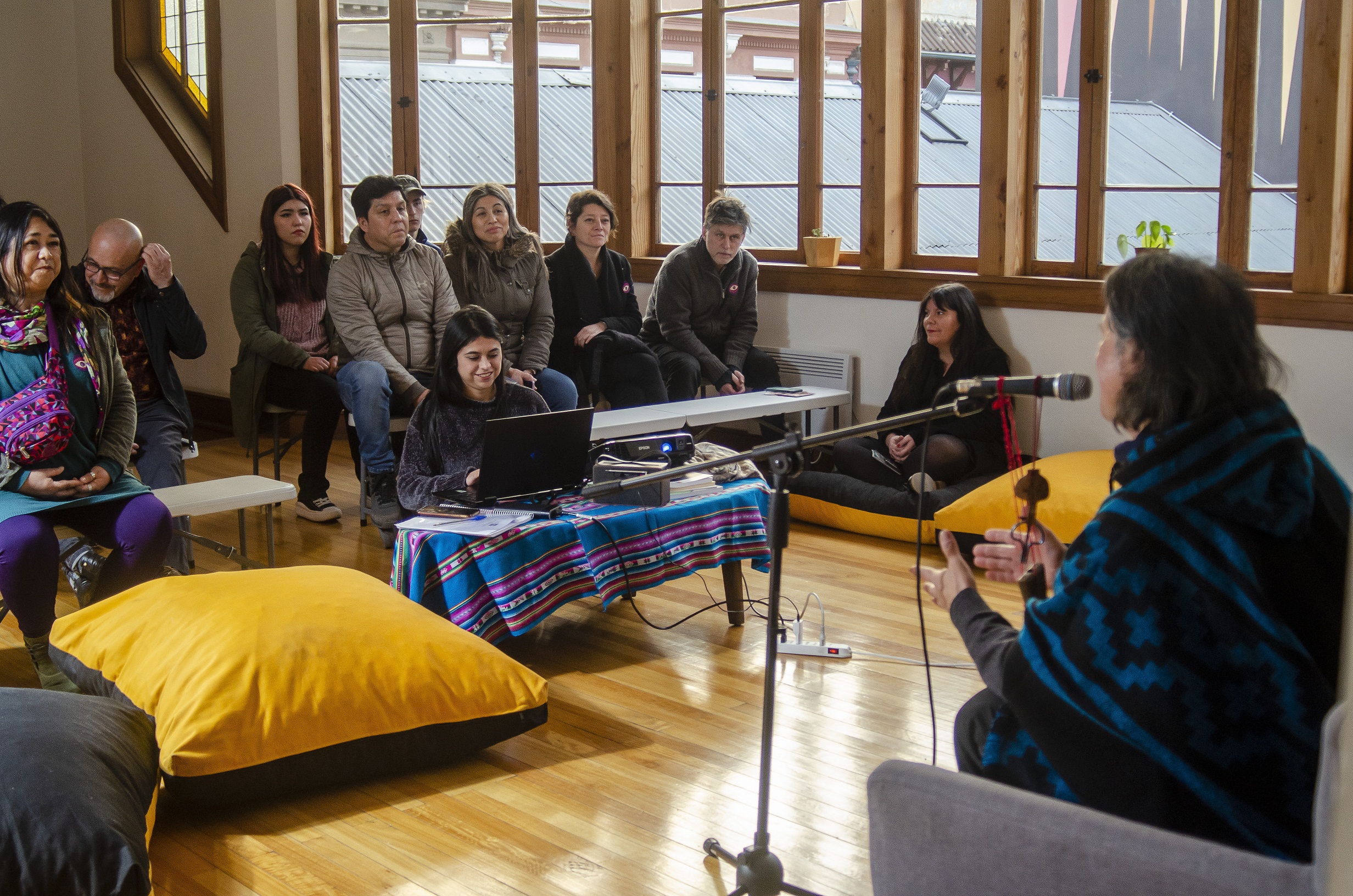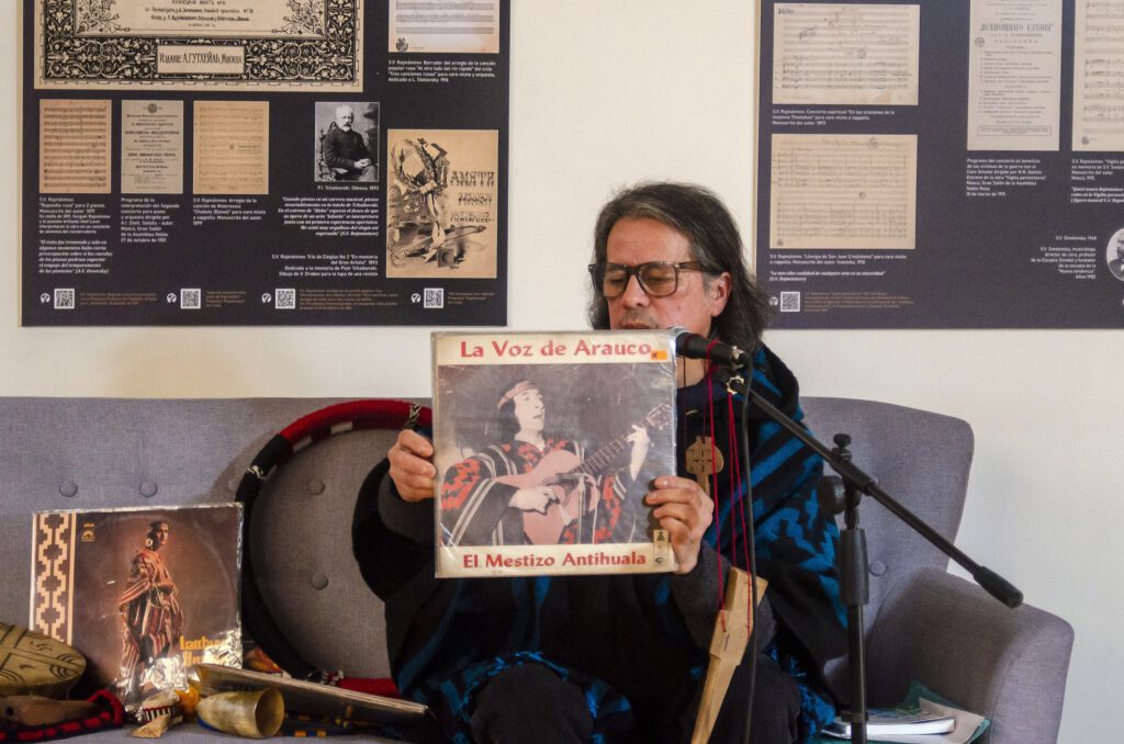 La charla consistió en la evolución de la música mapuche en vinilo, desde lo docto, como lo grabado por Rayén Quitral, hasta lo popular, con intérpretes como el Trío Nahuelpangui y José Railef.