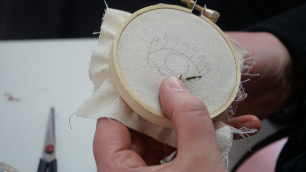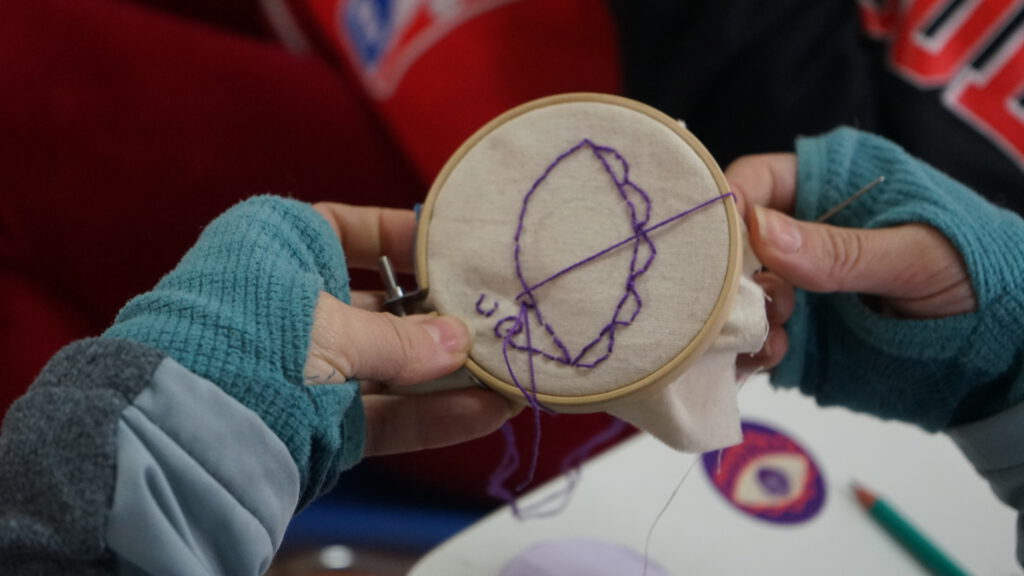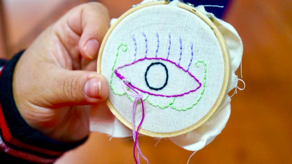 La segunda actividad fue un taller de bordado que fue efectuado el día 13 a partir de las 14:00 horas, que contó con la participación de algunas voluntarias del Museo Violeta Parra y donde se les enseñó a las internas, algunas puntadas de bordado para recrear el ojo de Violeta Parra, un símbolo creado por la artista para su afiche de su exposición en el Museo de Artes Decorativas de París, en 1964.