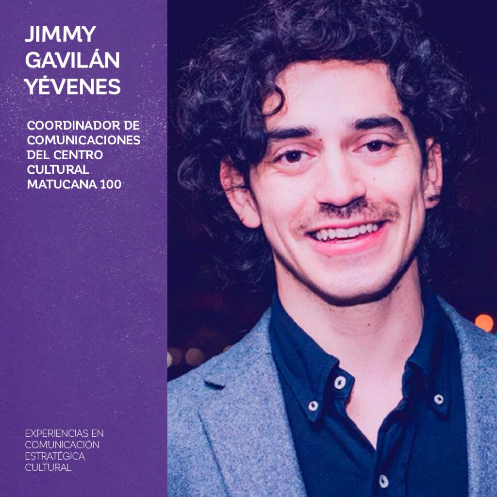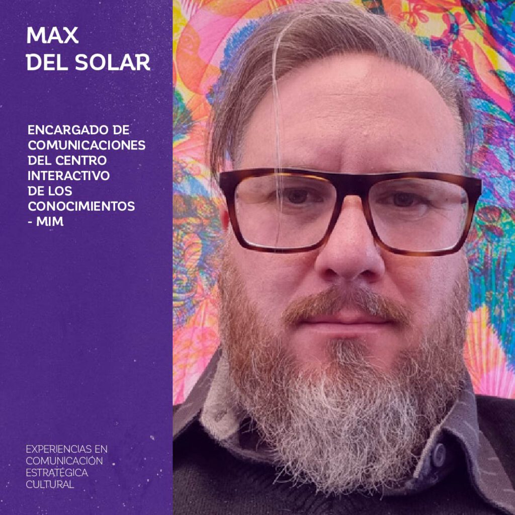 El conversatorio contará con invitados e invitadas de distintas instituciones culturales de nuestro país: Tanya Hirsch, subdirectora de Comunicaciones de la Fundación Artesanías de Chile; Jimmy Gavilán, director de Comunicaciones del Centro Cultural Matucana 100; Max del Solar, encargado de Comunicaciones del Centro Interactivo de los Conocimientos- MIM; Carmen Sánchez, coordinadora de Marketing y Comunicaciones del Teatro Biobío; Paula Valles, coordinadora del área de comunicaciones del Museo de la Solidaridad Salvador Allende (MSSA); Francisca Yévenes, coordinadora de Contenidos y Comunicaciones del Museo Violeta Parra, Francisca Yévenes, y Mariana Poblete, Community Manager del Museo Violeta Parra.